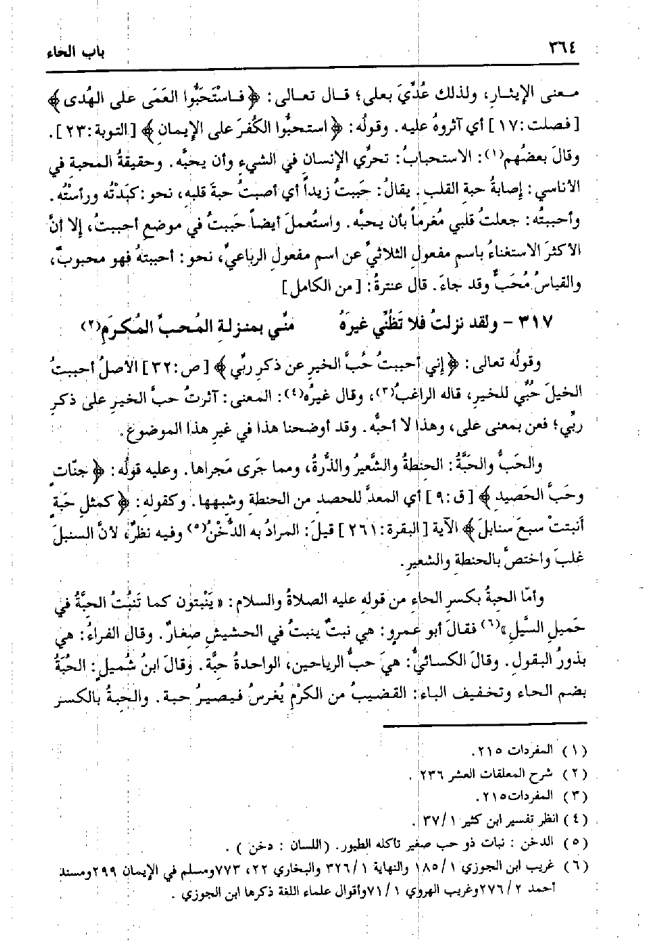 معنى الإيثار، ولذلك عدي بعلى؛ قال تعالى: {فاستحبوا العمى على الهدى} [فصلت: 17] أي آثروه عليه. وقوله {استحبوا الكفر على الإيمان} [التوبة:23]. وقال بعضهم: الاستحباب: تحري الإنسان في الشيء وأن يحبه. وحقيقة المحبة في الأناسي: إصابة حبة القلب. يقال: حببت زيدًا أي أصبت حبة قلبه، نحو: كبدته ورأسته. وأحببته: جعلت قلبي مغرمًا بأن يحبه. واستعمل أيضًا حببت في موضع أحببت، إلا أالأكثر الاستغناء باسم مفعول الثلاثي عن اسم مفعول الرباعي، نحو: أحببته فهو محبوب، والقياس محب وقد جاء. قال عنترة: [من الكامل]