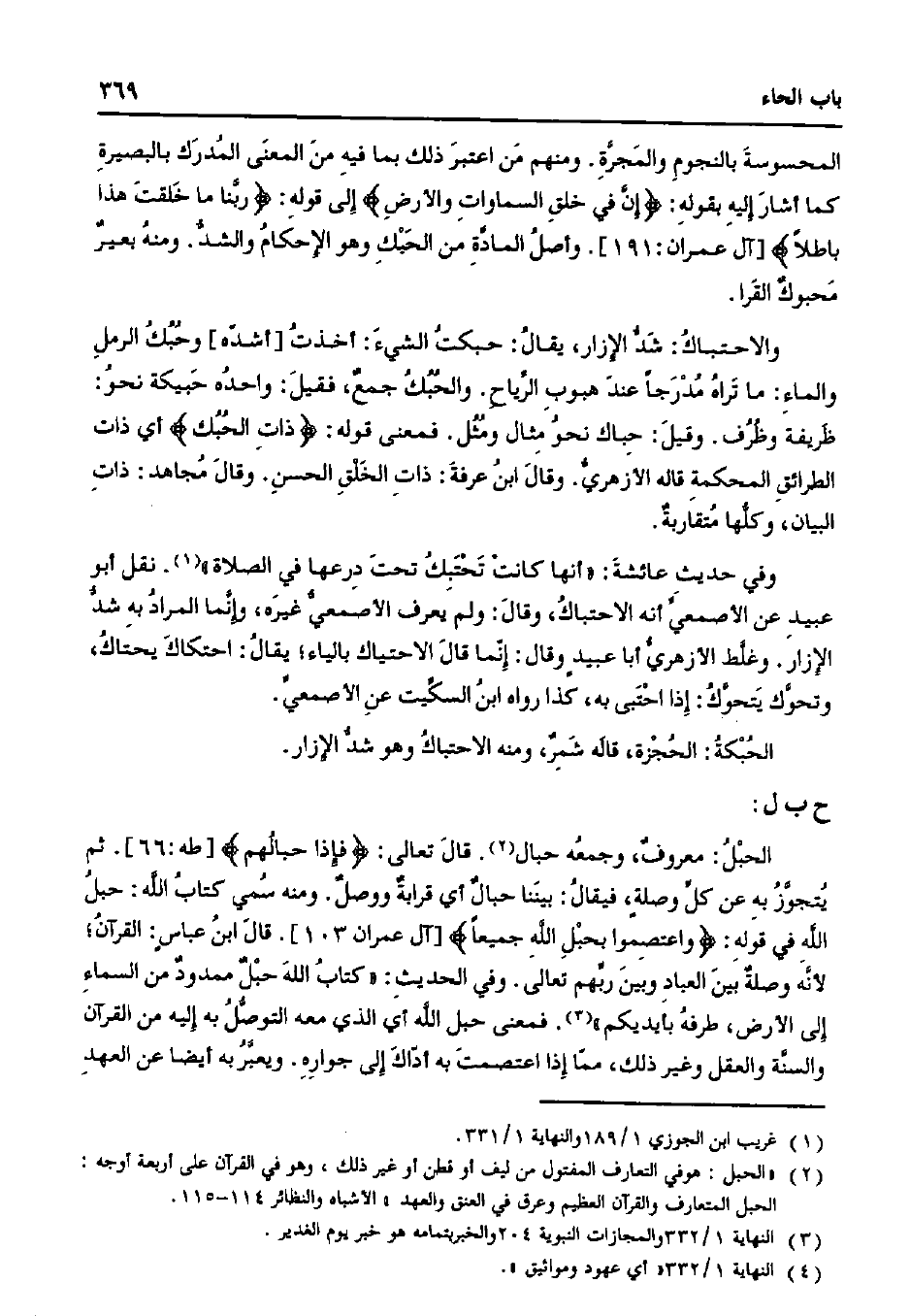 الحبل: معروف، وجمعه حبال. قال تعالى: {فإذا حبالهم} [طه: 66]. ثم يتجوز به عن كل وصلة، فيقال: بيننا حبال أي قرابة ووصل. ومنه سمي كتاب الله: حبل الله في قوله: {واعتصموا بحبل الله جميعًا} [آل عمران 103]. قال ابن عباس: القرآن؛ لأنه وصلة بين العباد وبين ربهم تعالى. وفي الحديث: "كتاب الله حبل ممدود من السماء إلى الأرض، طرفه بأيديكم". فمعنى حبل الله أي الذي معه التوصل به إليه من القرآن والسنة والعقل وغير ذلك، مما إذا اعتصمت به أداك إلى جواره. ويعبر به أيضاً عن العهد
