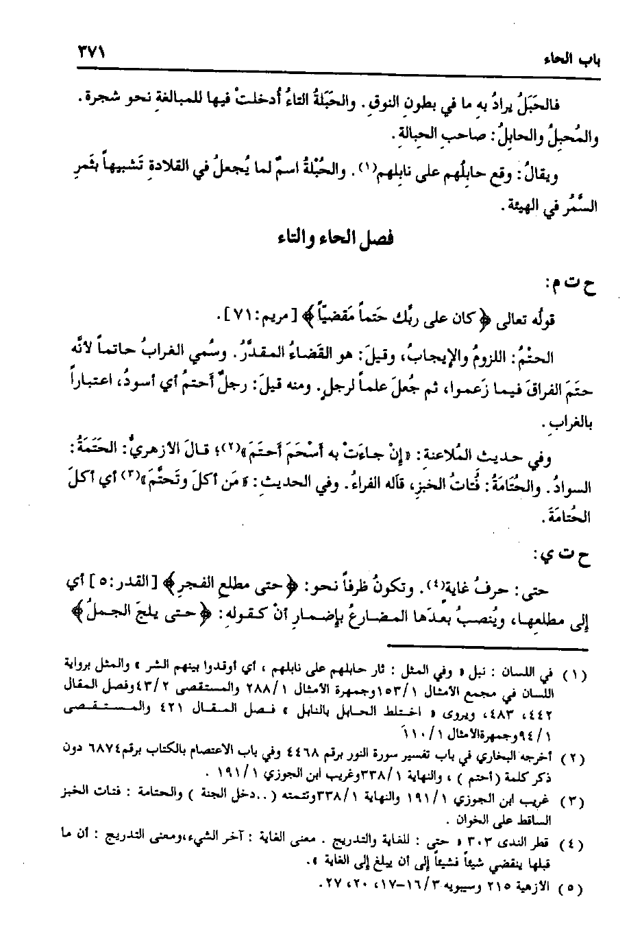 وفي حديث النلاعنة: "إن جاءت به أحسم أحتم"؛ قال الأزهري: الحتمة: السواد. والحتامة: فتات الخبز، قاله الفراء. وفي الحديث: "من أكل وتتحتم" أي أكل الحتامة.