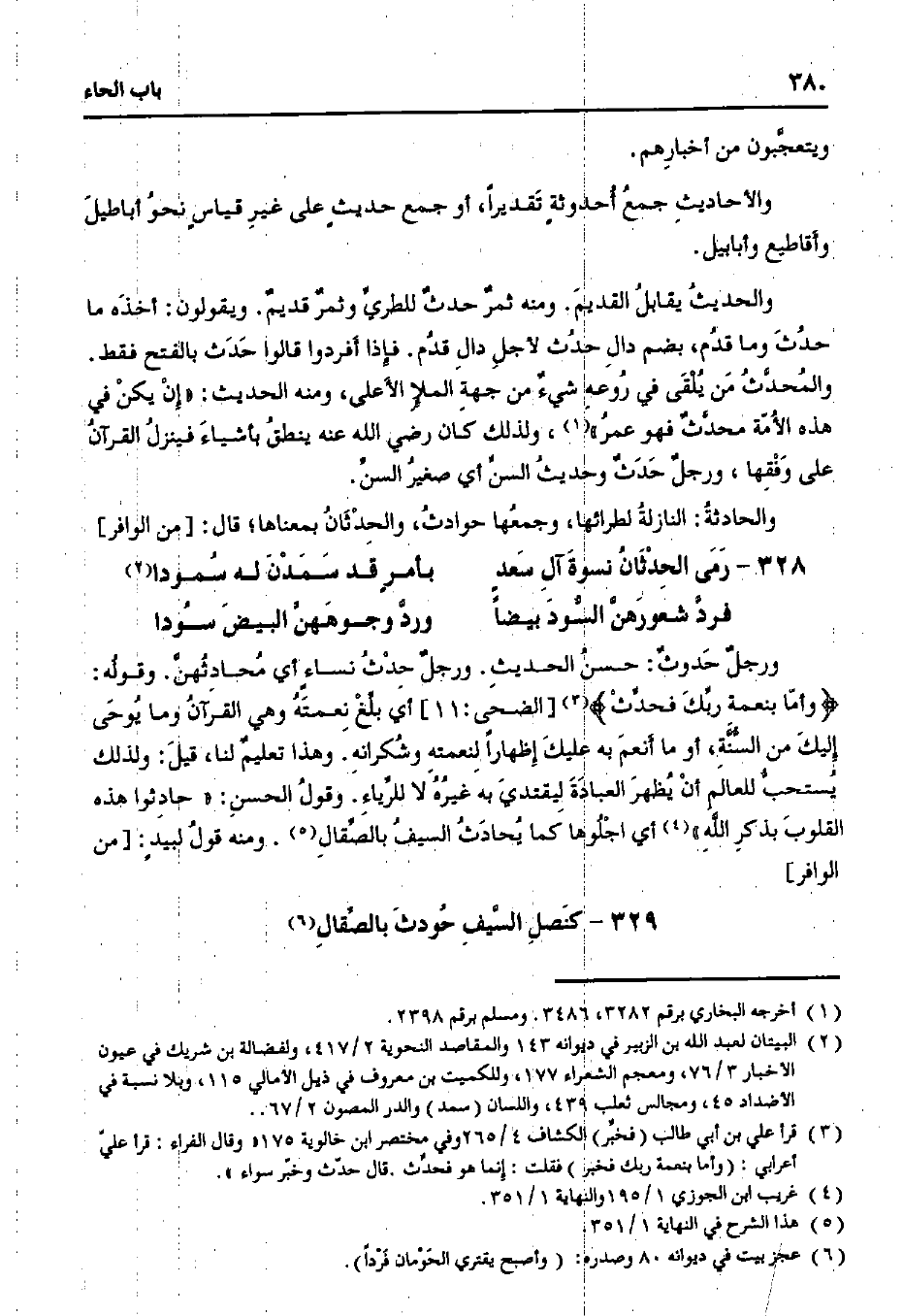 ورجل حدوث: حسن الحديث. ورجل حدث نساء أي محادثهن. وقوله: {وأما بنعمة ربك فحدث} [الضحى:11] أي بلغ نعمته وهي القرآن وما يوحى إليك من السنة، أو ما أنعم به عليك إظهاراُ لنعمته وشكرانه. وهذا تعليم لنا، قيل: ولذلك يستحب للعالم أن يظهر العبادة ليتقدي به غيره لا للرياء. وقول الحسن:"حادثوا هذه القلوب بذكر الله" أي اجلوها كما يحادث السيف بالصقال. ومنه قول لبيد: [من الوافر]