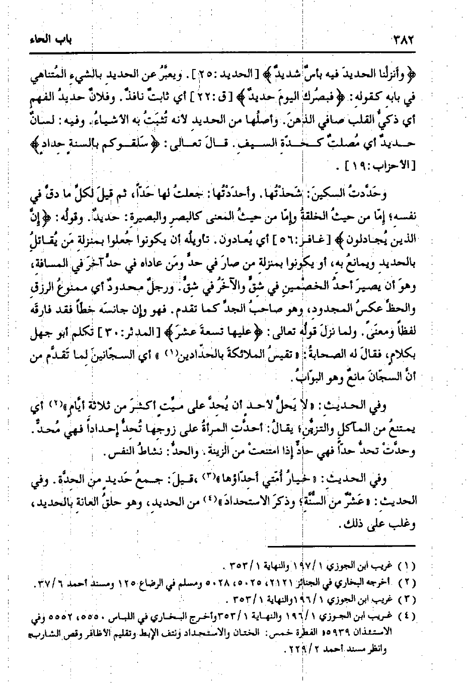 وحددت السكين: شحذتها. وأحددتها: جعلت لها حداً، ثم قيل لكل ما دق في نفسه؛ إما من حيث الخلقة وإما من حيث المعني كالبصر والبصيرة: حديد. وقوله: {إن الذين يجادلون} [غافر:56] أي يعادون. تأويله أن يكونوا جعلوا بمنزله من يقاتل بالحديد ويمانع به، أو يكونوا بمنزلة من صار في حد ومن عاداه في حد آخر في المسافة، وهو أن يصير أحد الخصمين في شق والآخر في شق. ورجل محدود أي ممنوع الرزق والحظ عكس المجدود، وهو صاحب الجد كما تقدم. فهو وإن جانسه خطاً فقد فارقه لفظاً ومعنى. ولما نزل قوله تعالى: {عليها تسعة عشر} [المدثر:30] تكلم أبو جهل بكلامٍ، فقال له الصحابة:"تقيس الملائكة بالحدادين" أي السجانين لما تقدم من أن السجان مانع وهو البواب.