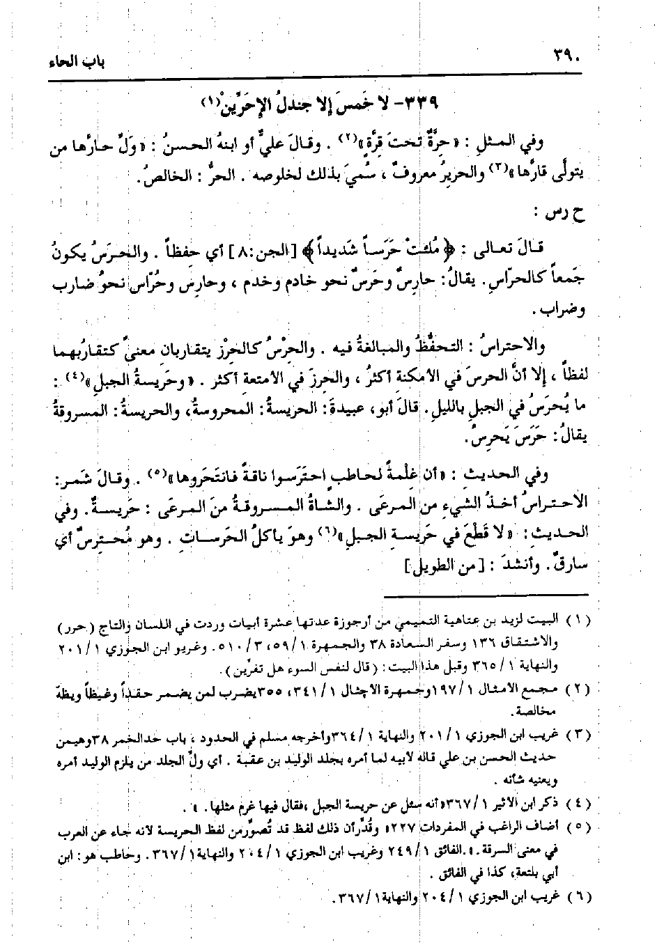 وفي مثل: (حرة تحت قرة). وقال على أو ابنه الحسن: (ول حارها من يتولى قارها) والحرير معروف، سمي بذلك لخصومة. الحر: الخالص.