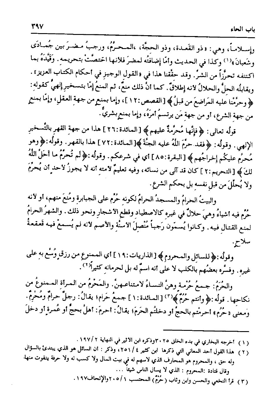 والبيت الحرام والمسجد الحرام لكونه حرم على الجبابرة ومنع منهم، أو لأنه حرم فيه أشياء وهي حلال في غيره كالاصطياد وقطع الأشجار ونحو ذلك. والشهر الحرام لمنع القتال فيه. وكانوا يسمون رجبا منصل الأسنة والأصم لأنه لم يسمع فيه قعقعة سلاح.