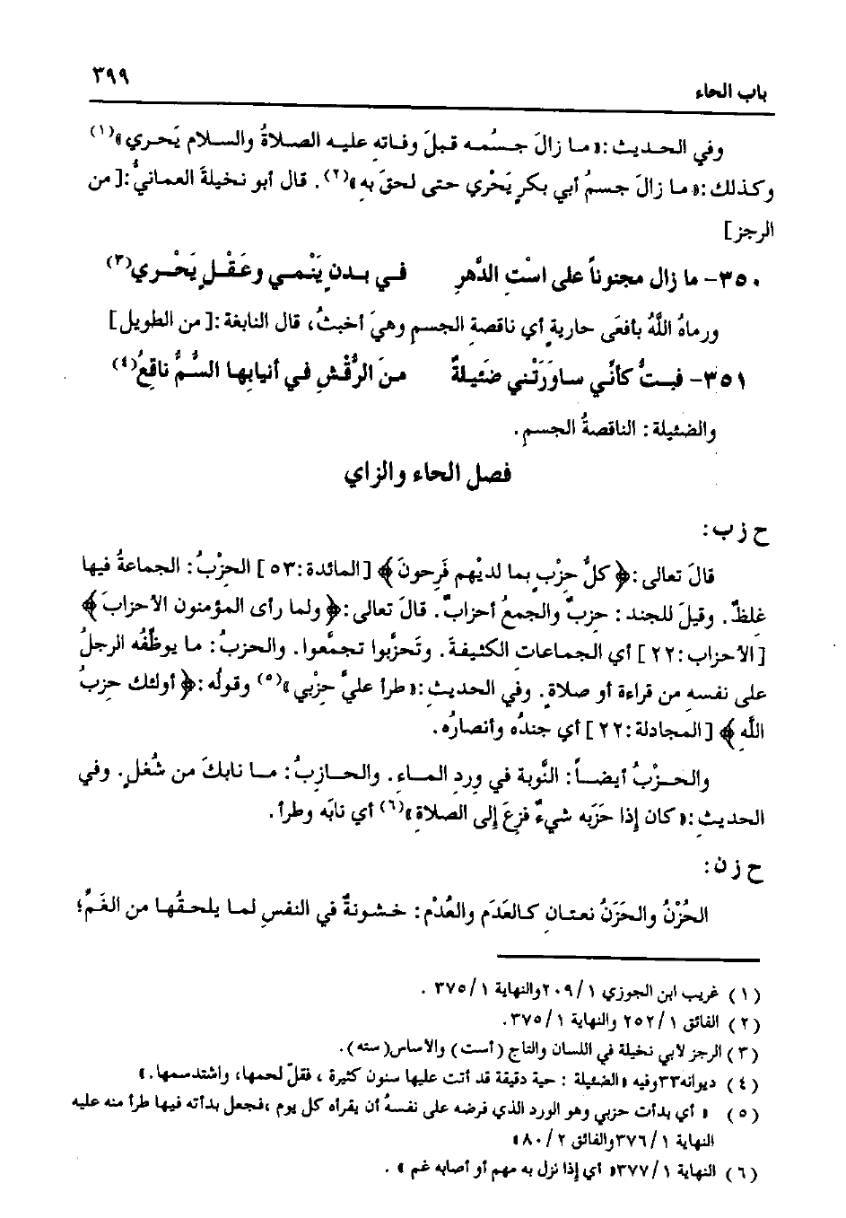قال تعالى: {كل حزب بما لديهم فرحون} [المائدة: 53] الحزب: الجماعة فيها غلظ. وقيل للجند: حزب والجمع أحزاب. قال تعالى: {ولما رأى المؤمنون الأحزاب} [الأحزاب: 22] أي الجماعات الكثيفة. وتحزبوا تجمعوا. والحزب: ما يوفه الرجل على نفسه من قراءة أو صلاة. وفي الحديث: (طرأ على حزبي) وقوله: {أولئك حزب الله} بالمجادلة: 22] أي جنده وأنصاره.