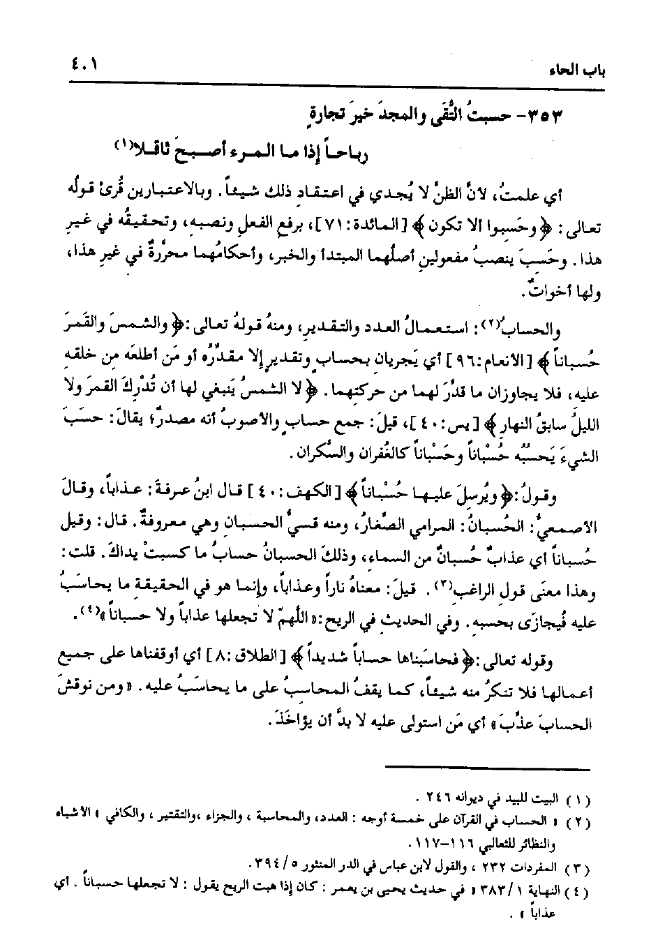 والحساب: استعمال العدد والتقدير، ومنه قوله تعالى: {والشمس والقمر حسبانا} [الأنعام: 96] أي يجريان بحساب وتقدير إلا مقدره أو من أطلعه من خلقه عليه، فلا يجاوزان ما قدر لهما من حركتهما. {لا الشمس ينبغي لها أن تدرك القمر ولا الليل سابق النهار} [يس: 40] قال ابن عرفة: عذابا، وقال الأصمعي: الحسبان: المرامي الصغار، ومنه قسي الحسبان وهي معروفة. قال: وقيل حسبانا أي عذاب حسبان من السماء، وذلك الحسبان حساب ما كسبت يداك. قلت: وهذا معنى قول الراغب. قيل: معناه نارا وعذابا، وإنما هو في الحقيقة ما يحاسب عليه فيجازي بحسبه. وفي الحديث في الريح: (اللهم لا تجعلها عذابا ولا حسبانا).