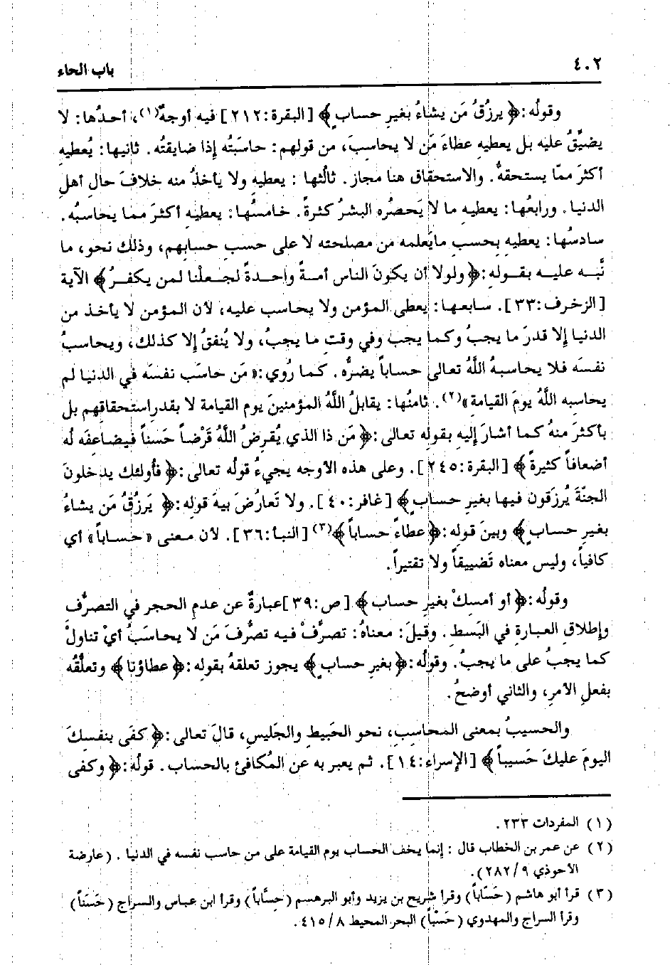 وقوله: {يرزق من يشاء بغير حساب} [البقرة: 212] فيه أوجه، أحدها: لا يضيق عليه بل يعطيه عطاء من لا يحاسب، من قولهم: حاسبته إذا ضايقته. ثانيها: يعطيه أكثر مما يستحقه. والاستحقاق هنا مجاز. ثالثها: يعطيه ولا يأخذ منه خلاف حال أهل الدنيا. ورابعها: يعطيه ما لا يحصره البشر كثرة. خامسها: يعطيه أكثر مما يحاسبه. سادسها: يعطيه بحسب ما يعلمه من مصلحته لا على حسب حسابهم، وذلك نحو، ما نبه عليه بقوله: {ولولا أن يكون الناس أمة واحدة لجعلنا لمن يكفر} الآية [الزخرف: 33]. سابعها: يعطي المؤمن ولا يحاسب عليه، لأن المؤمن لا يأخذ من الدنيا إلا قدر ما يجب وكما يجب وفي وقت ما يجب، ولا ينفق إلا كذلك، ويحاسب نفسه فلا يحاسبه الله تعالى حسابا يضره. كما روى: (من حاسب نفسه في الدنيا لم يحاسبه الله يوم القيامة). ثامنها: يقابل الله المؤمنين يوم القيامة لا بقدر استحقاقهم بل بأكثر منه كما أشار إليه بقوله تعالى: {من ذا الذي يقرض الله قرضا حسنا فيضاعفه له أضعافا كثيرة} [البقرة: 245]. وعلى هذه الأوجه يجيء قوله تعالى: {فأولئك يدخلون الجنة يرزقون فيها بغير حساب} [غافر: 40]. ولا تعارض بيه قوله: {يرزق من يشاء بغير حساب} وبين قوله: {عطاء حسابا} [النبأ: 36]. لأن معنى (حسابا) أي كافيا، وليس معناه تتضييقا ولا تقتيرا.
