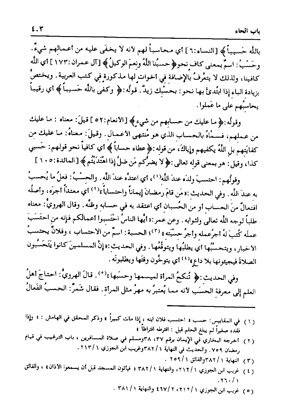 وقولهم: احتسب ولده عند الله، أي اعتده عند الله. والحسب: فعل ما يحسب به عند الله. وفي الحديث: (من قام رمضان إيمانا واحتسابا) أي معتدا أجره، وأصله افتعال من الحساب أو من الحسبان أي اعتقد به في حسابه وظنه. وقال الهروي: معناه طلبا لوجه الله تعالى ولثوابه. وعن عمر: (أيها الناس احتسبوا أعمالكم فإنه من احتسب عمله كتب له أجر عمله وأجر حسبته)؛ الحسبة: اسم من الاحتساب، وفلان يحتسب الأخبار، ويتحسبها أي يطلبها ويتوقعها. وفي الحديث: (إن المسلمين كانوا يتحسبون الصلاة فيجيئونها بلا داع) أي يتوخون وقتها ويطلبونه. وفي الحديث: (تنكح المرأة لميسمها وحسبها). قال الهروي: احتاج أهل العلم إلى معرفة الحسب لأنه مما يعتبر به مثل المرأة. فقال شمر: الحسب الفعال