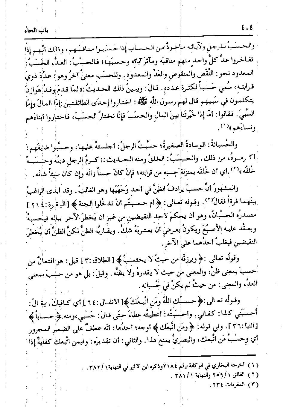 والحسب للرجل ولآبائه مأخوذٌ من الحساب إذا حسبوا مناقبهم، وذلك أنهم إذا تفاخروا عد كل واحد منهم مناقبه ومآثر آبائه وحسبها؛ فالحسب: العد، الحسب: المعدود نحو: النقص والمنقوص والعد والمعدود. وللحسب معنى آخر وهو: عدد ذوي قرابته، سمي حسبًا لكثرة عدده. قال: ويبين ذلك الحديث: «لما قدم وفد هوازن يتكلمون في سبيهم قال لهم رسول الله -صلى الله عليه وسلم -: اختاروا إحدى الطائفتين: إما المال وإما السبي. فقالوا: أما إذا خيرتنا بين المال والحسب فإنا نختار الحسب، فاختاروا أبناءهم ونساءهم».