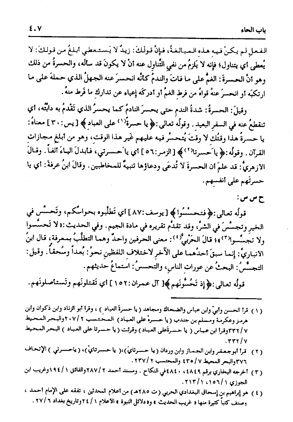 قوله تعالى: {فتحسسوا} [يوسف: 87] أي تطلبوه بحواسكم، وتحسس في الخير وتجسس في الشر، وقد تقدم تقريره في مادة الجيم. وفي الحديث: «لا تحسسوا ولا تجسسوا»؛ قال الحربي: معنى الحرفين واحدٌ وهما التطلب بمعرفة، قال ابن الأنباري: إنما سبق أحدهما على الآخر لاختلاف اللفظين نحو: بعدًا وسحقًا. وقيل: التجسس: البحث عن عورات الناس، والتحسس: استماع حديثهم.