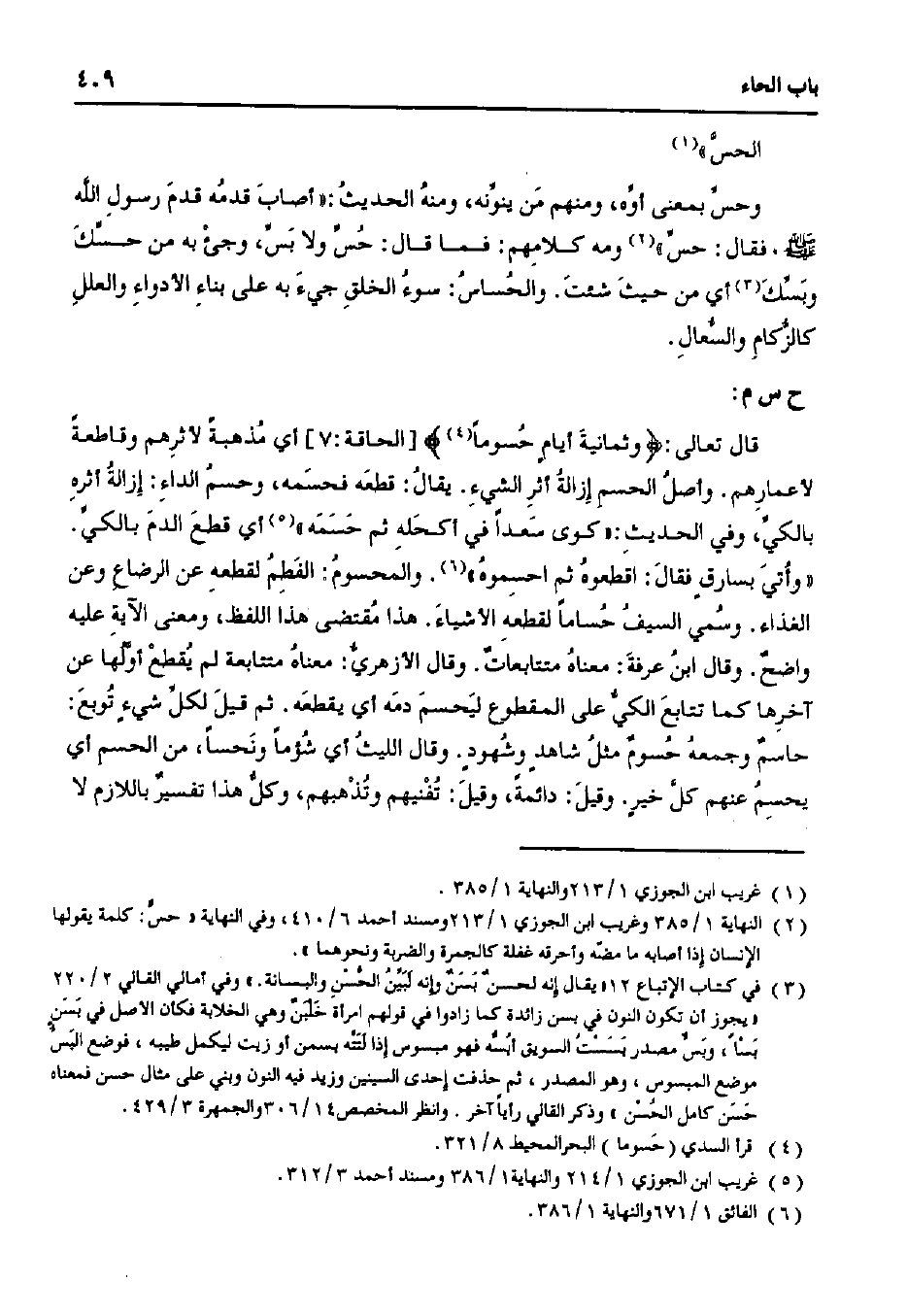 قال تعالى: {وثمانية أيامٍ حسومًا} [الحاقة: 7] أي مذهبةً لأثرهم وقاطعةً لأعمارهم. وأصل الحسم إزالة أثر الشيء. يقال: قطعه فحسمه، وحسم الداء: إزالة أثره بالكي، وفي الحديث: «كوى سعدًا في أكحله ثم حسمه» أي قطع الدم بالكي. «وأتي بسارقٍ فقال: اقطعوه ثم احسموه». والمحسوم: الفطم لقطعه عن الرضاع وعن الغذاء. وسمي السيف حسامًا لقطعه الأشياء. هذا مقتضى هذا اللفظ، ومعنى الآية عليه واضحٌ. وقال ابن عرفة: معناه متتابعاتٌ. وقال الأزهريٌ: معناه متتابعة لم يقطع أولها عن آخرها كما تتابع الكي على المقطوع ليحسم دمه أي يقطعه. ثم قيل لكل شيء توبع: حاسمٌ وجمعه حسومٌ مثل شاهدٍ ومشهودٍ. وقال الليث أي شؤمًا ونحسًا، من الحسم أي يحسم عنهم كل خيرٍ. وقيل: دائمةً، وقيل: تفنيهم وتذهبهم، وكل هذا تفسيرٌ باللازم لا