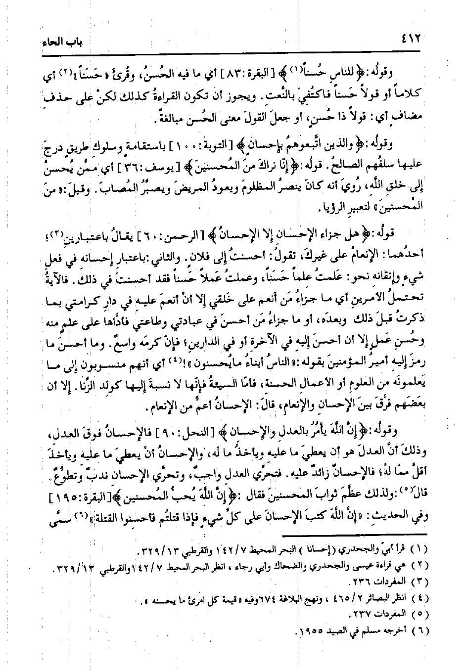 وقوله: {والذين اتبعوهم بإحسان} [التوبة: 100] باستقامة وسلوك طريقٍ درج عليها سلفهم الصالح. قوله: {إنا نراك من المحسنين} [يوسف: 36] أي ممن يحسن إلى خلق الله، روي أنه كان ينصر المظلوم ويعود المريض ويصبر المصاب. وقيل: «من المحسنين» لتعبير الرؤيا.