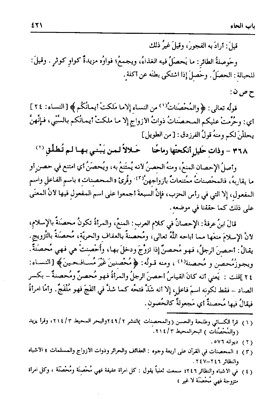 وأصل الإحصان المنع، ومنه الحصن لأنه يمتنع به، ويحصن أي امتنع في حصن أو ما يقاربه، فالمحصنات ممتنعاتٌ بأزواجهن. وقرئ «المحصنات» باسم فاعل واسم المفعول، إلا التي في رأس الحزب، فإن السبعة أجمعوا على اسم المفعول فيها لأن المعنى على ذلك كما حققنا في موضعه.