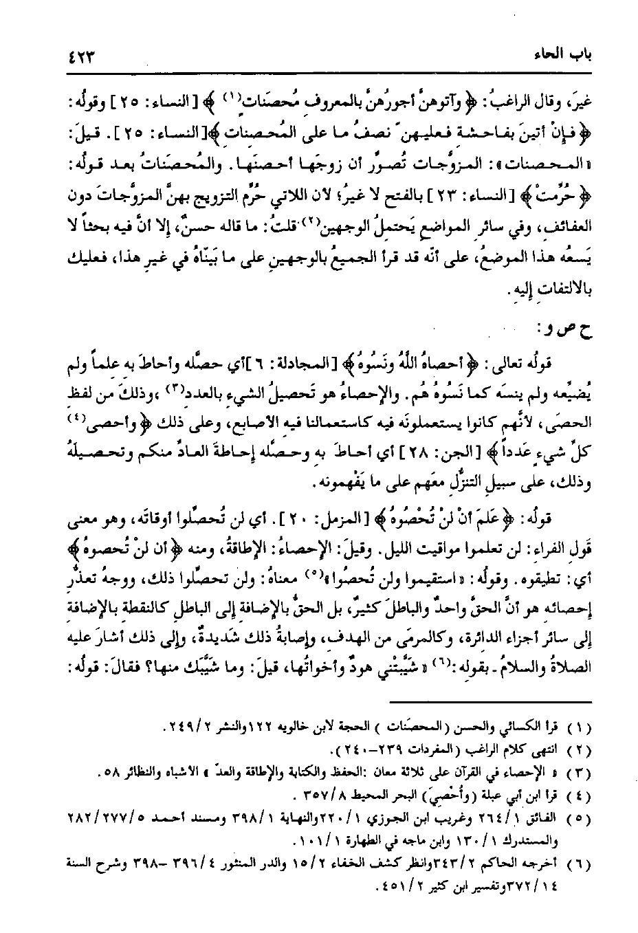 غير، وقال الراغب: {وآتوهن أجورهن بالمعروف محصنات} [النساء: 25] وقوله: {فإن أتين بفاحشة فعليهن نصف ما على المحصنات} [النساء: 25] قيل: «المحصنات»: المزوجات تصور أن زوجها أحصنها. والمحصنات بعد قوله {حرمت} [النساء: 23] بالفتح لا غير؛ لأن اللاتي حرم التزويج بهن المزوجات دون العفائف، وفي سائر المواضع يحتمل الوجهين قلت: ما قاله حسنٌ، إلا أن فيه بحثًا لا يسعه هذا الموضع، على أنه قد قرأ الجميع بالوجهين على ما بيناه في غير هذا، فعليك بالالتفات إليه.