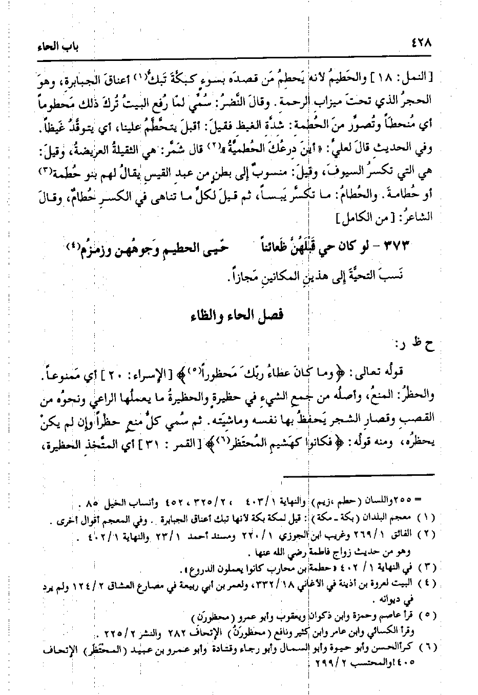 [النمل: 18] والحطيم لأنه يحطم من قصده بسوءٍ كبكة تبك أعناق الجبابرة، وهو الحجر الذي تحت ميزاب الرحمة. وقال النضر: سمي لما رفع البيت ترك ذلك محطومًا أي منحطًا وتصور من الحطمة: شدة الغيظ فقيل: أقبل يتحطم علينا، أي يتوقد غيظًا. وفي الحديث قال لعلي: «أين درعك الحطيمة» قال شمر: هي الثقيلة العريضة، وقيل: هي التي تكسر السيوف، وقيل: منسوب إلى بطنٍ من عبد القيس يقال لهم بنو حطمة أو حطامة. والحطام: ما تكسر يبسًا، ثم قيل لكل ما تناهى في الكسر حطام، وقال الشاعر: [من الكامل]