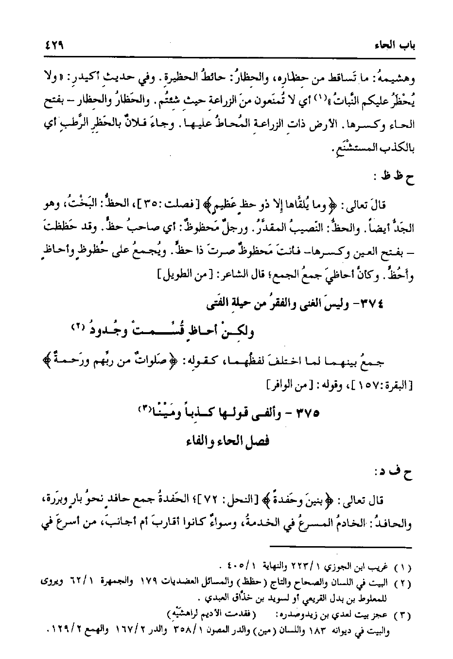 قال تعالى: {وما يلقاها إلا ذو حظ عظيمٍ} [فصلت: 35]، الحظ: البخت، وهو الجد أيضًا. والحظ: النصيب المقدر. ورجل محظوظ: أي صاحب حظ. وقد حظظت- بفتح العين وكسرها- فأنت محظوظ صرت ذا حظٍّ. ويجمع على حظوظٍ وأحاظٍ وأحظٍّ. وكأن أحاظي جمع الجمع؛ قال الشاعر: [من الطويل]