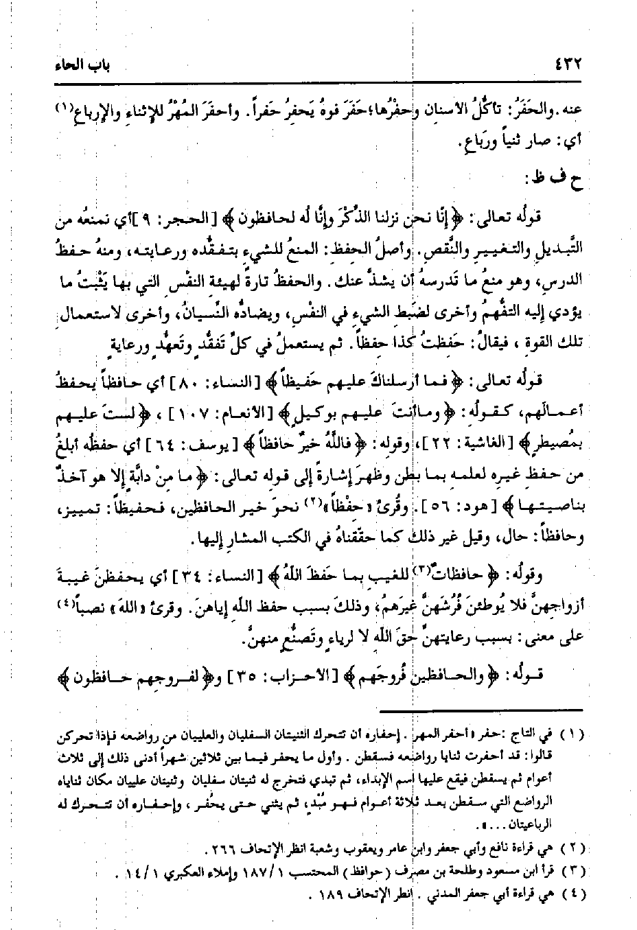 قوله تعالى: {إنا نحن نزلنا الذكر وإنا له لحافظون} [الحجر: 9] أي نمنعه من التبديل والتغيير والنقص. وأصل الحفظ: المنع للشيءٍ بتفقده ورعايته، ومنه حفظ الدرس، وهو منع ما تدرسه أن يشذ عنك. والحفظ تارةً لهيئة النفس التي بها يثبت ما يؤدي إليه التفهم وأخرى لضبط الشيء في النفس، ويضاده النسيان، وأخرى لاستعمال تلك القوة، فيقال: حفظت كذا حفظًا. ثم يستعمل في كل تفقدٍ وتعهدٍ ورعايةٍ.