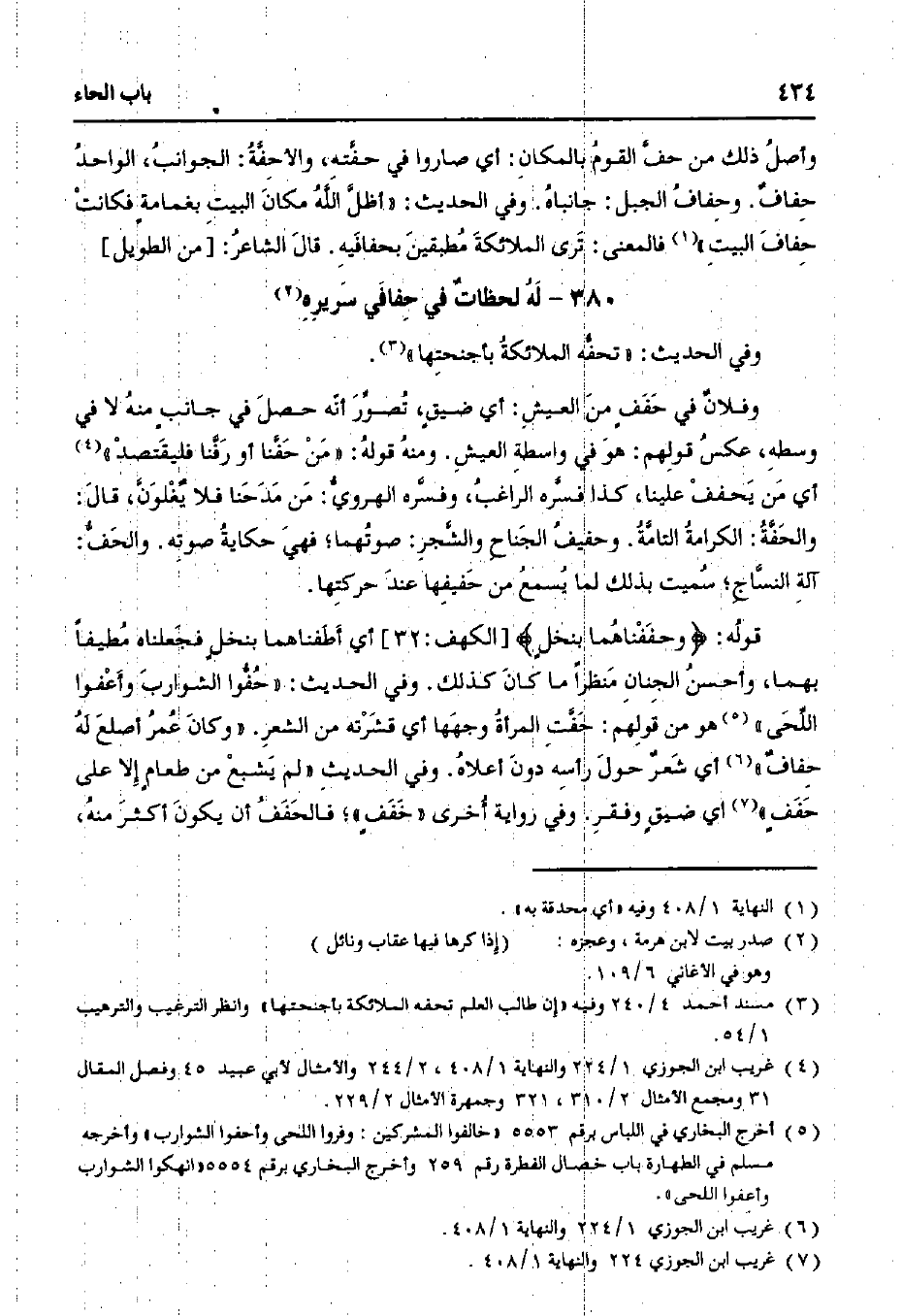 قوله: {وحففناهما بنخلٍ} [الكهف:32] أي أطفناهما بنخلٍ فجعلناه مطفيًا بهما، وأحسن الجنان منظرًا ما كان كذلك. وفي الحديث: «حفوا الشوارب وأعفوا اللحى» هو من قولهم: حفت المرأة وجهها أي قشرته من الشعر. «وكان عمر أصلع له حفاف» أي شعر حول رأسه دون أعلاه. وفي الحديث «لم يشبع من طعامٍ إلا على حففٍ» أي ضيقٍ وفقر. وفي رواية أخرى «خففٍ» فالحفف أن يكون أكثر منه،