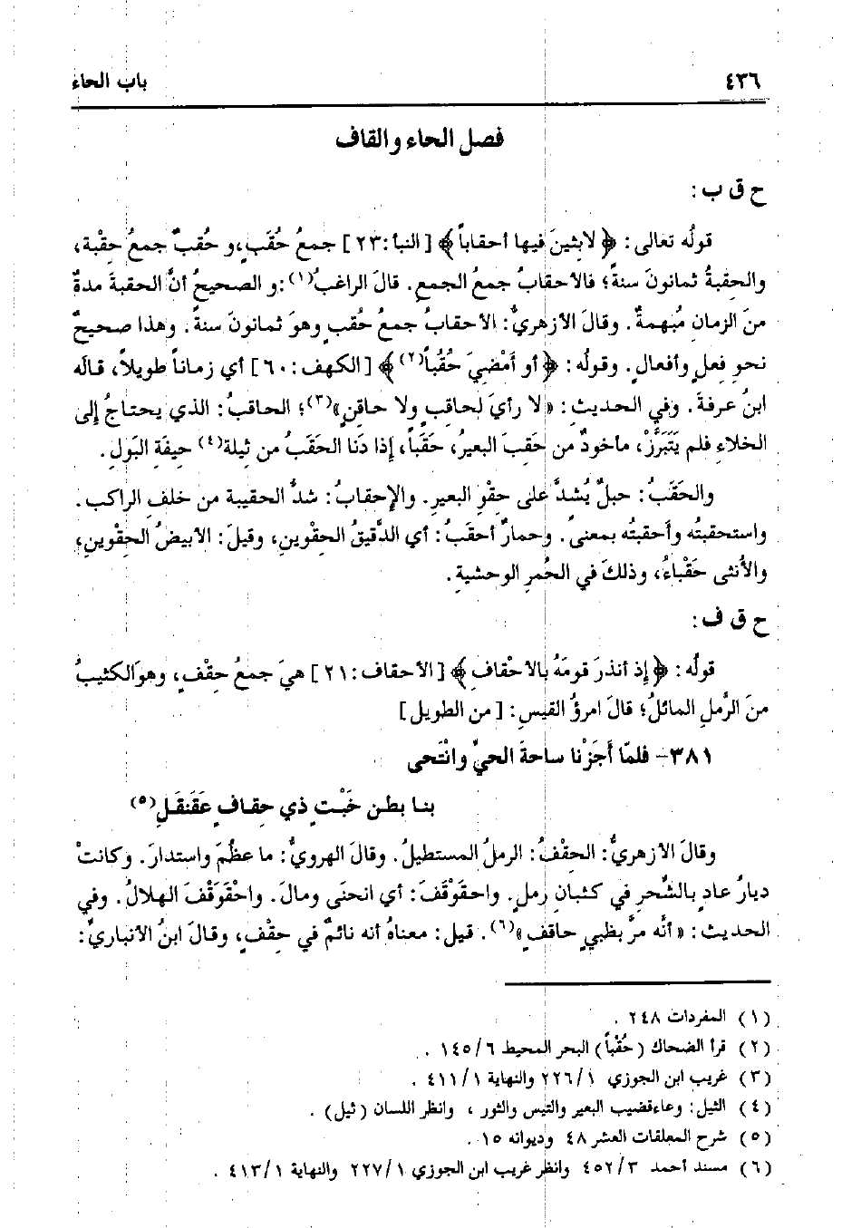 قوله تعالى: {لابثين فيها أحقابًا} [النبأ:23] جمع حقبٍ، وحقب جمع حقبة، والحقبة ثمانون سنةً؛ فالأحقاب جمع الجمع. قال الراغب: والصحيحٍ أن الحقبة مدة من الزمان مبهمة. وقال الأزهري: الأحقاب جمع حقبٍ وهو ثمانون سنةً. وهذا صحيح نحو فعلٍ وأفعالٍ. وقوله: {أو أمضي حقبًا} [الكهف:60] أي زمانًا طويلًا، قاله ابن عرفة. وفي الحديث: «لا رأي لحاقبٍ ولا حاقنٍ»؛ الحاقب: الذي يحتاج إلى الخلاء فلم يتبرز، مأخوذ من حقب البعير، حقبًا، إذا دنا الحقب من ثيلة حيفة البول.