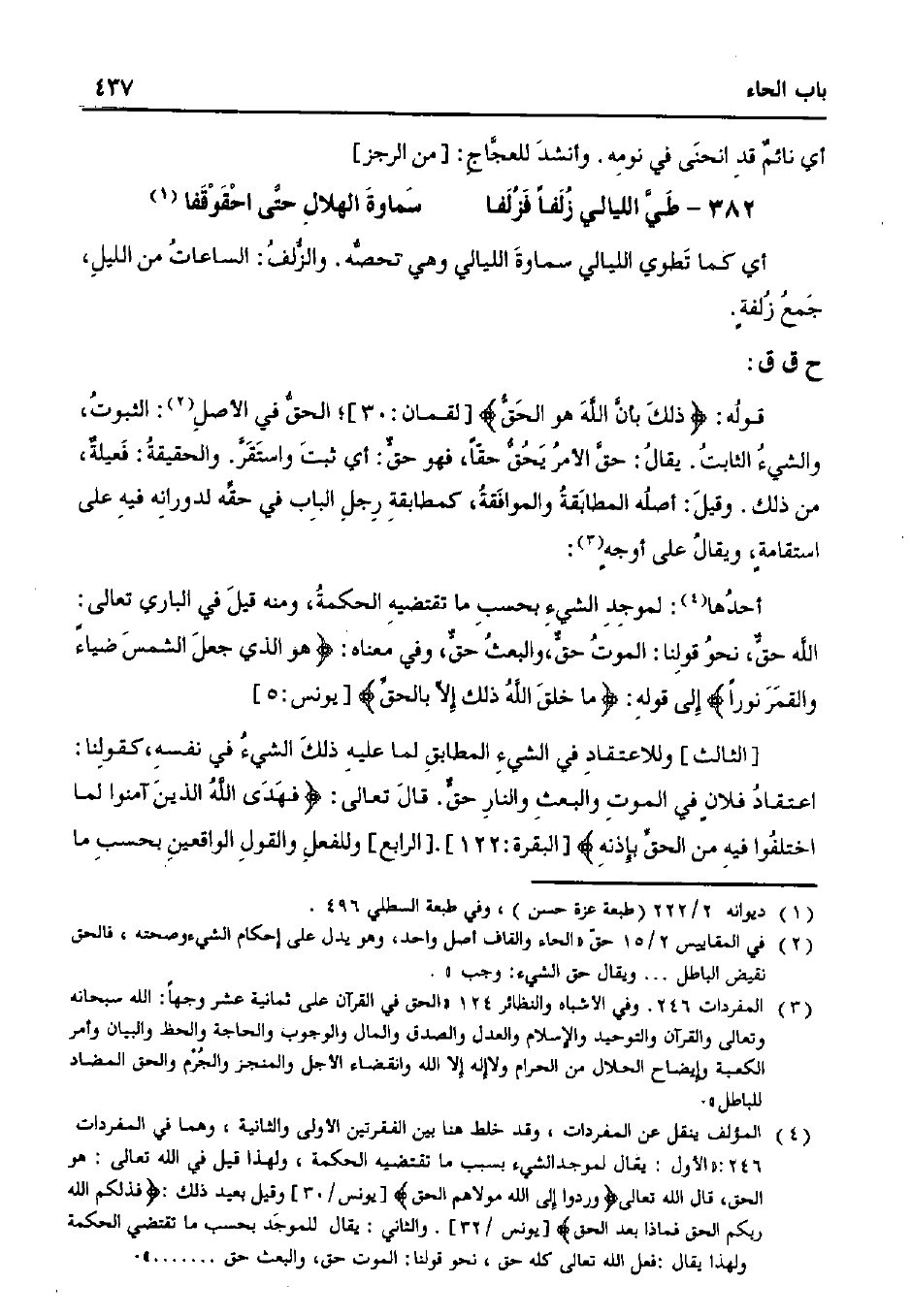 [الثالث] وللاعتقاد في الشيء المطابق لما عليه ذلك الشيء في نفسه، كقولنا: اعتقاد فلانٍ في الموت والبعث والنار حق. قال تعالى: {فهدى الله الذين آمنوا لما اختلفوا فيه من الحق بإذنه} [البقرة:122]. [الرابع] وللفعل والقول الواقعين بحسب ما