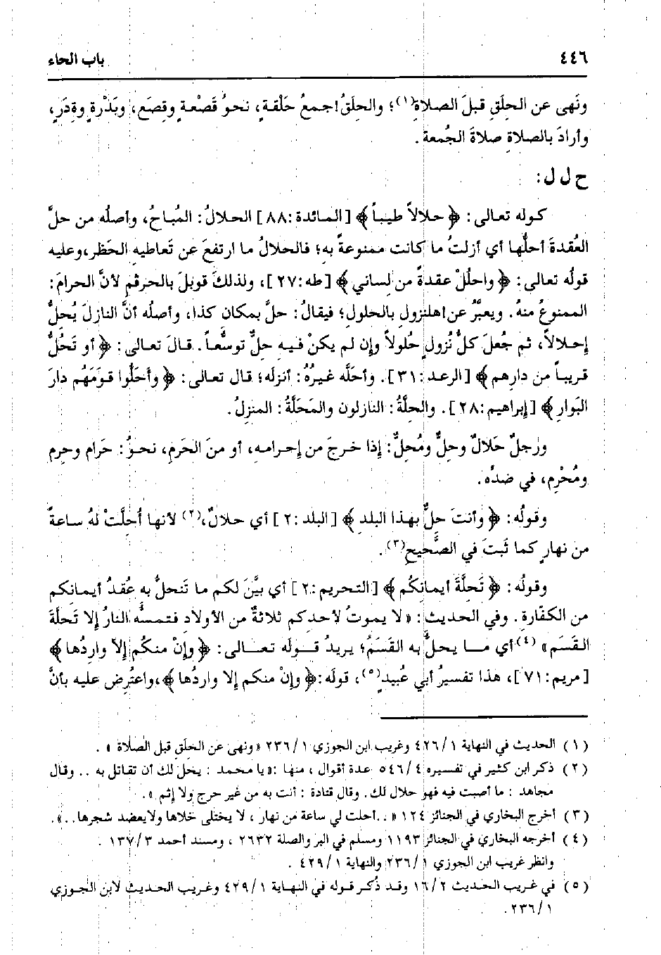 وقوله: {تحلة أيمانكم} [التحريم: 2] أي بين لكم ما تنحل به عقد أيمانكم من الكفارة. وفي الحديث: "لا يموت لأحدكم ثلاثةٌ من الأولاد فتمسه النار إلا تحلة القسم" أي ما يحل به القسم، يريد قوله تعالي: {وإن منكم إلا واردها} [مريم: 71]، هذا تفسير أبي عبيدٍ، قوله: {وإن منكم إلا واردها}، واعترض عليه بأن