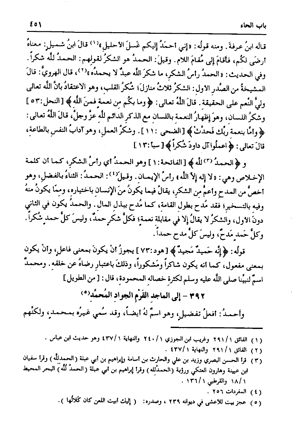 و {الحمد لله} [الفاتحة:1] وهو الحمد أي رأس الشكر، كما أن كلمة الإخلاص وهي: "لا إله إلا الله" رأس الإيمان. وقيل: الحمد: الثناء بالفضل، وهو أخص من المدح وأعم من الشكر، يقال فيما يكون من الإنسان باختياره، ومما يكون منه وفيه بالتسخير، فقد مدح بطول القامة، كما مدح ببذل المال. والحمد يكون في الثاني دون الأول، والشكر لا يقال إلا في مقابلة نعمةٍ، فكل شكرٍ حمدٌ، وليس كل حمدٍ شكرًا. وكل حمدٍ مدحٌ، وليس كل مدح حمدًا.