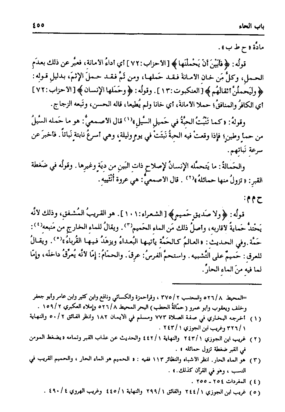 قوله: {ولا صديق حميمٍ} [الشعراء: 101]. هو القريب المشفق، وذلك لأنه يحتد حماية لأقاربه، وأصل ذلك من الماء الحميم. ويقال للماء الخارج من منبعه: حمة. وفي الحديث: "العالم كالحمة يأتيها البعداء ويزهد فيها القرباء". ويقال للغرق: حميم على التشبيه. واستحم الفرس: عرق. والحمام: إما لأنه يعرق داخله، وإما لما فيه من الماء الحار.