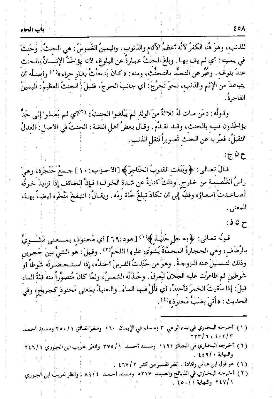 للذنب، وهو هنا الكفر لأنه أعظم الآثام والذنوب. واليمين الغموس: هي الحنث. وحنث في يمينه: أي لم يف بها. وبلغ الحنث عبارة عن البلوغ، لأنه يؤاخذ الإنسان بالحنث عند بلوغه. وعبر عن التعبد بالتحنث، ومنه: "كان يتحنث بغار حراء" وأصله أن يتباعد من الإثم والذنب، نحو تحرج: أي جانب الحرج، فقيل: الحنث العظيم: اليمين الفاجرة.