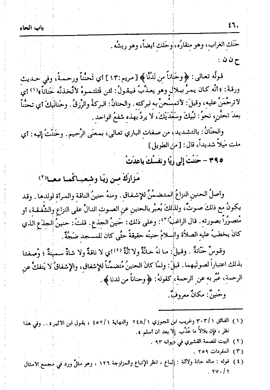 قوله تعالى: {وحنانًا من لدنا} [مريم: 13] أي تحننا ورحمة، وفي حديث ورقة: "أنه كان يمر ببلالٍ وهو يعذب فيقول: لئن قتلتموه لأتخذنه حنانًا" أي لأترحمن عليه، وقيل: لأتمسح نه لبركته. والحنان: البركة والرزق. وحنانيك أي تحننًا بعد تحننٍ، نحو: لبيك وسعديك، لا يرد بهذه شفع الواحد.