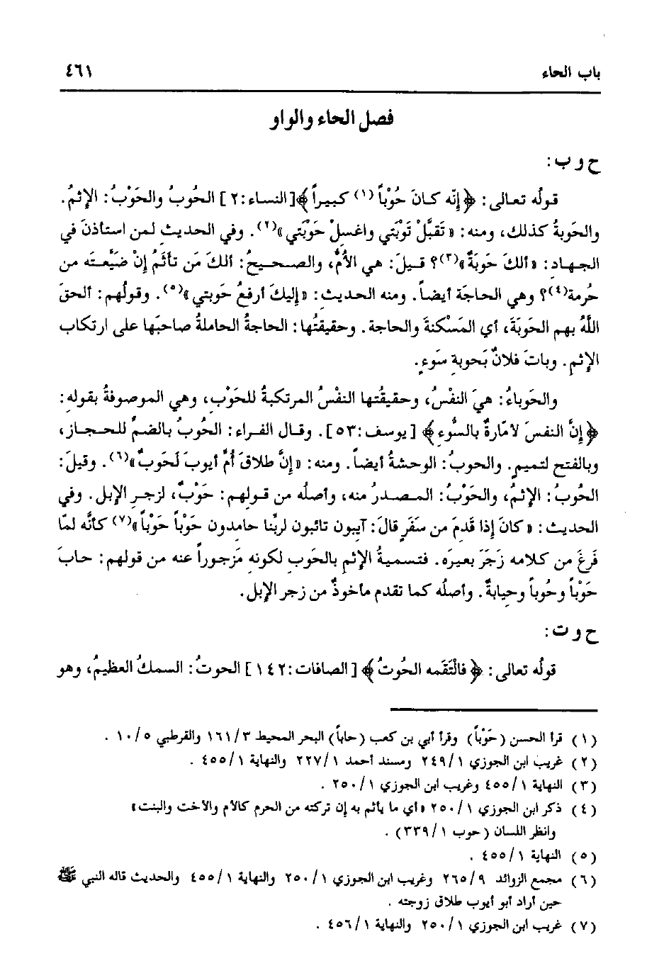 قوله تعالى: {إنه كان حوبًا كبيرًا} [النساء: 2] الحوب والحوب: الإثم. والحوبة كذلك، ومنه: "تقبل توبتي واغسل حويتي". وفي الحديث لمن استأذن في الجهاد: "ألك حوبة"؟ قيل: هي الأم، والصحيح: ألك من تأثم إن ضيعته من حرمة؟ وهي الحاجة أيضًا. ومنه الحديث: "إليك أرفع حوبتي". وقولهم: ألحق الله بهم الحوبة، أي المسكنة والحاجة. وحقيقتها: الحاجة الحاملة صاحبها على ارتكاب الإثم. وبات فلان بحوبة سوءٍ.