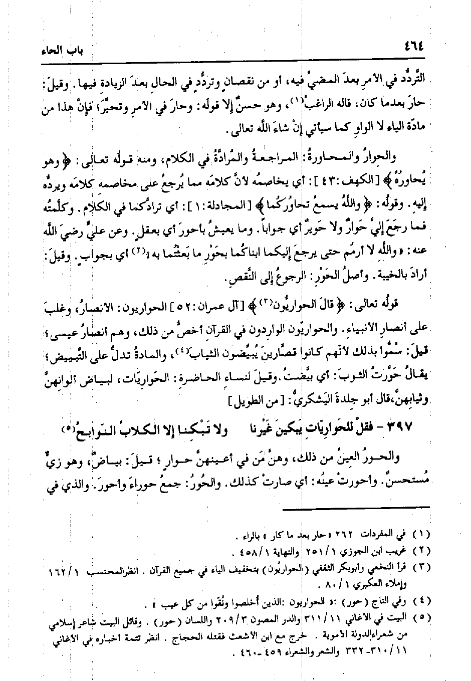 التردد في الأمر بعد المضي فيه، أو من نقصان وتردد في الحال بعد الزيادة فيها. وقيل: حار بعدما كان، قال الراغب، وهو حصن إلا قوله: وحار في الأمر وتحير؛ فإن هذا من مادة الياء لا الواو كما سيأتي إن شاء الله تعالى.