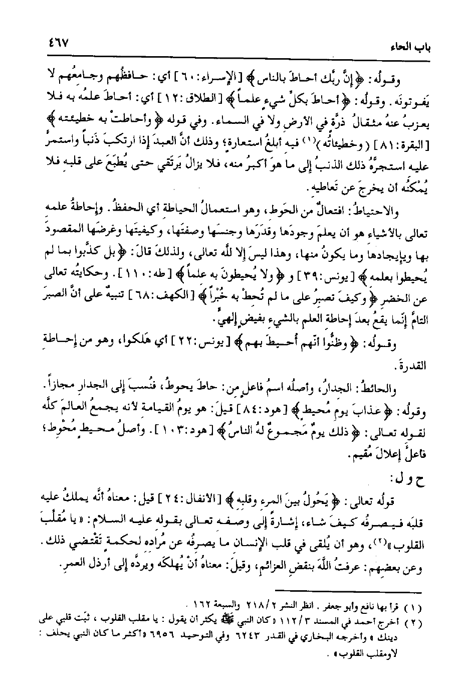 وقوله: {إن ربك أحاط بالناس} [الإسراء:60] أي: حافظهم وجامعهم لا يفوتونه. وقوله: {أحاط بكل شيء علمًا} [الطلاق:12] أي: أحاط علمه به فلا يعزب عنه مثقال ذرة في الأرض ولا في السماء. وفي قوله {وأحاطت به خطيئته} [البقرة: 81] (وخطيئاته) فيه أبلغ استعارةٍ؛ وذلك أن العبد إذا ارتكب ذنبًا واستمر عليه استجره ذلك الذنب إلى ما هو أكبر منه، فلا يزال يرتقي حتى يطبع على قلبه فلا يمكنه أن يخرج عن تعاطيه.