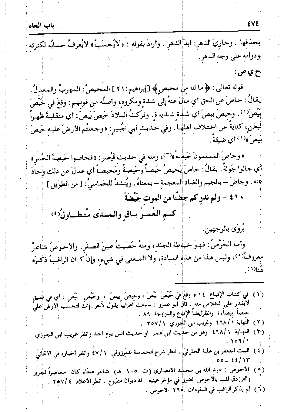 "وحاص المسلمون حيصة"، ومنه في حديث قيصر: "فحاصروا حيصة الحمر" أي جالوا جولة. يقال: حاص يحيص حيصًا ومحيصًا أي عدل عن ذلك وحاد عنه. وجاض- بالجيم والضاد المعجمة- بمعناه. وينشد للحماسي: [من الطويل].