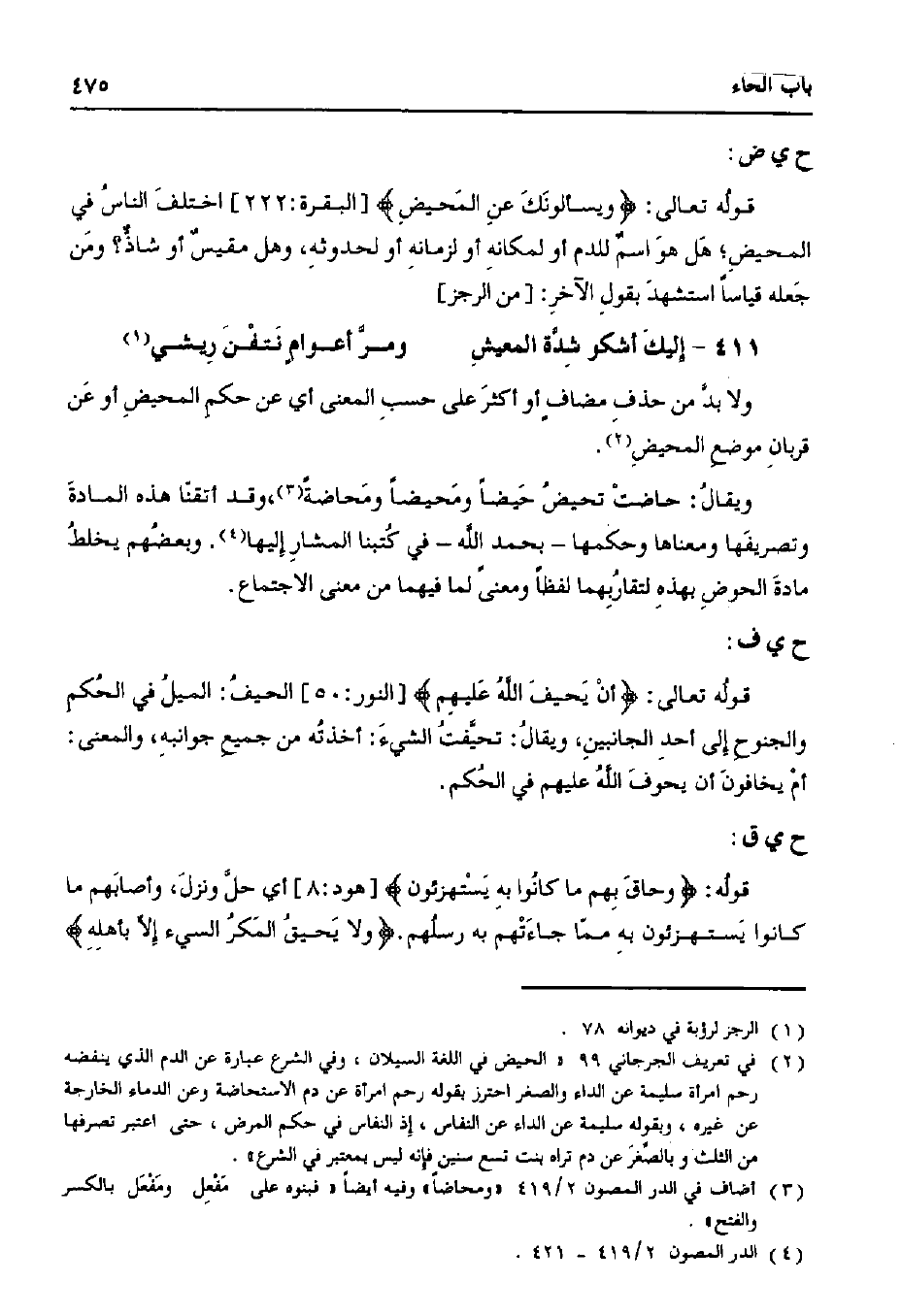 ويقال: حاضت تحيض حيضًا ومحيضًا ومحاضة، وقد أتقنا هذه المادة وتصريفها ومعناها وحكمها- بحمد الله- في كتبنا المشار إليها. وبعضهم يخلط مادة الحوض بهذه لتقاربها لفظًا ومعنى لما فيهما من معنى الاجتماع.