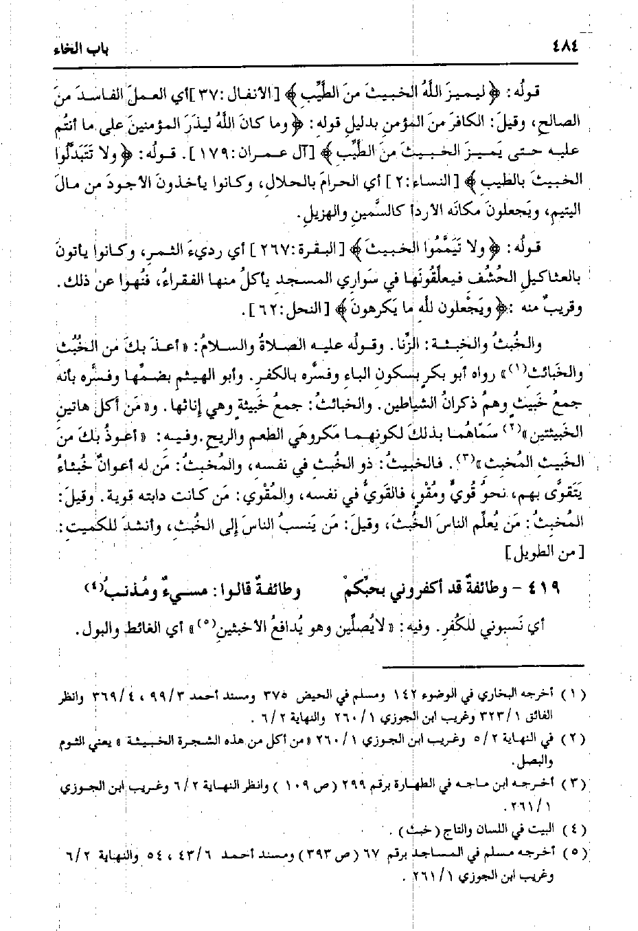 والخبث والخبثة: الزنا. وقوله عليه الصلاة والسلام: "أعذ بك من الخبث والخبائث" رواه أبو بكر بسكون الباء وفسره بالكفر. وأبو الهيثم بضمها وفسره بأنه جمع خبيث وهم ذكران الشياطين. والخبائث: جمع خبيثة وهي إناثها. و "من أكل هاتين الخبيثتين" سماهما بذلك لكونهما مكروهي الطعم والريح. وفيه: "أعوذ بك من الخبيث المخبث". فالخبيث: ذو الخبث في نفسه، والمخبث: من له أعوان خبثاء يتقوى بهم، نحو قوي ومقو، فالقوى في نفسه، والمقوي: من كانت دابته قوية. وقيل: المخبث: من يعلم الناس الخبث، وقيل: من ينسب الناس إلى الخبث، وأنشد للكميت: [من الطويل].