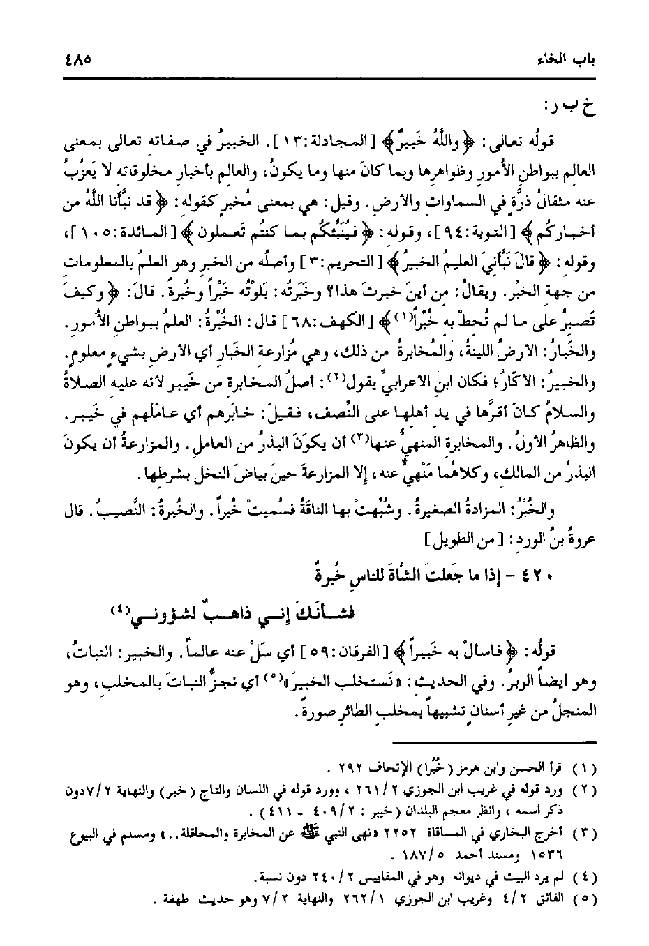 قوله: {فاسأل به خبيرًا} [الفرقان: 59] أي سل عنه عالمًا. والخبير: النبات، وهو أيضًا الوبر. وفي الحديث: "تستحلب الخبير" أي نجز النبات بالمخلب، وهو المنجل من غير أسنان بمخلب الطائر صورة.