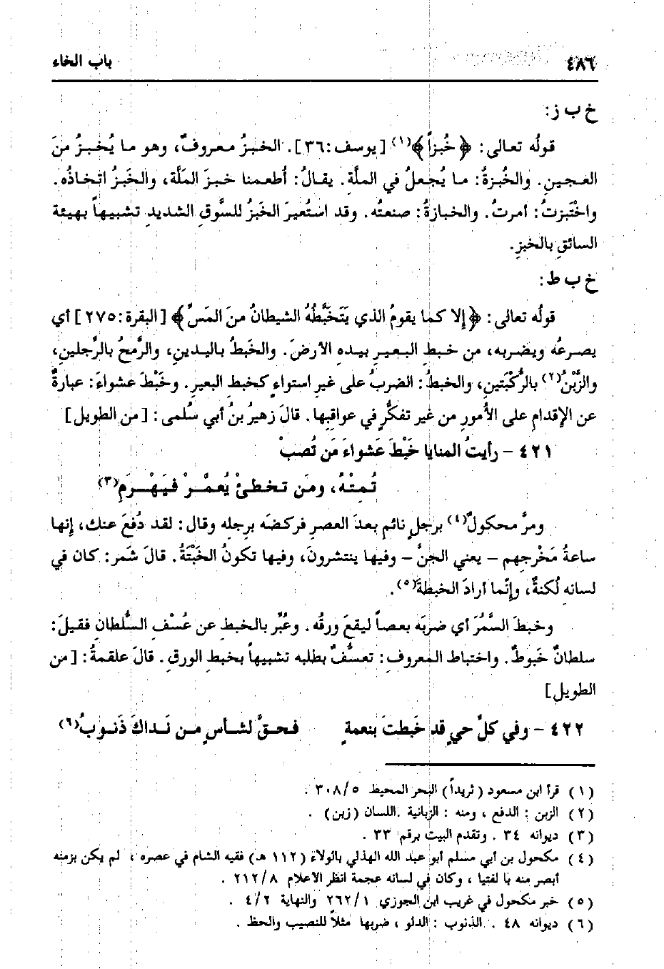 قوله تعالى: {إلا كما يقوم الذي يتخبطه الشيطان من المس} [البقرة: 275] أي يصرعه ويضربه، من خبط البعير بيده الأرض. والخبط باليدين، والرمح بالرجلين، والزبن بالركبتين، والخبط: الضرب على غير استواء كخبط البعير. وخبط عشواء: عبارة عن الإقدام على الأمور من غير تفكر في عواقبها. قال زهير بن أبي سلمى: [من الطويل]