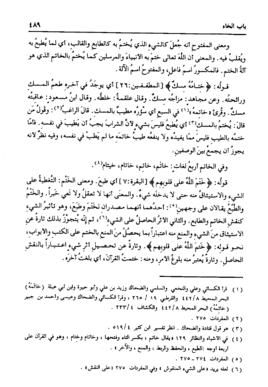 قوله: {ختامه مسك} [المطففين: 26] أي يوجد في آخره طعم المسك ورائحته. وعن مجاهد: مزاجه مسك. وقال علقمة: خلطه. وقال ابن مسعود: عاقبته مسك. وقرئ "خاتمه" في السبع أي سؤره مطيب بالمسك. قال الراغب: وقول من قال: يختم بالمسك أي يطبع فليس بشيء لأن الشراب يجب أن يطيب في نفسه. فأما ختمه بالطيب فليس مما يفيده ولا ينفعه طيب خاتمه ما لم يطب في نفسه، وفيه نظر لأنه يجوز أن يجمع بين الوصفين.
