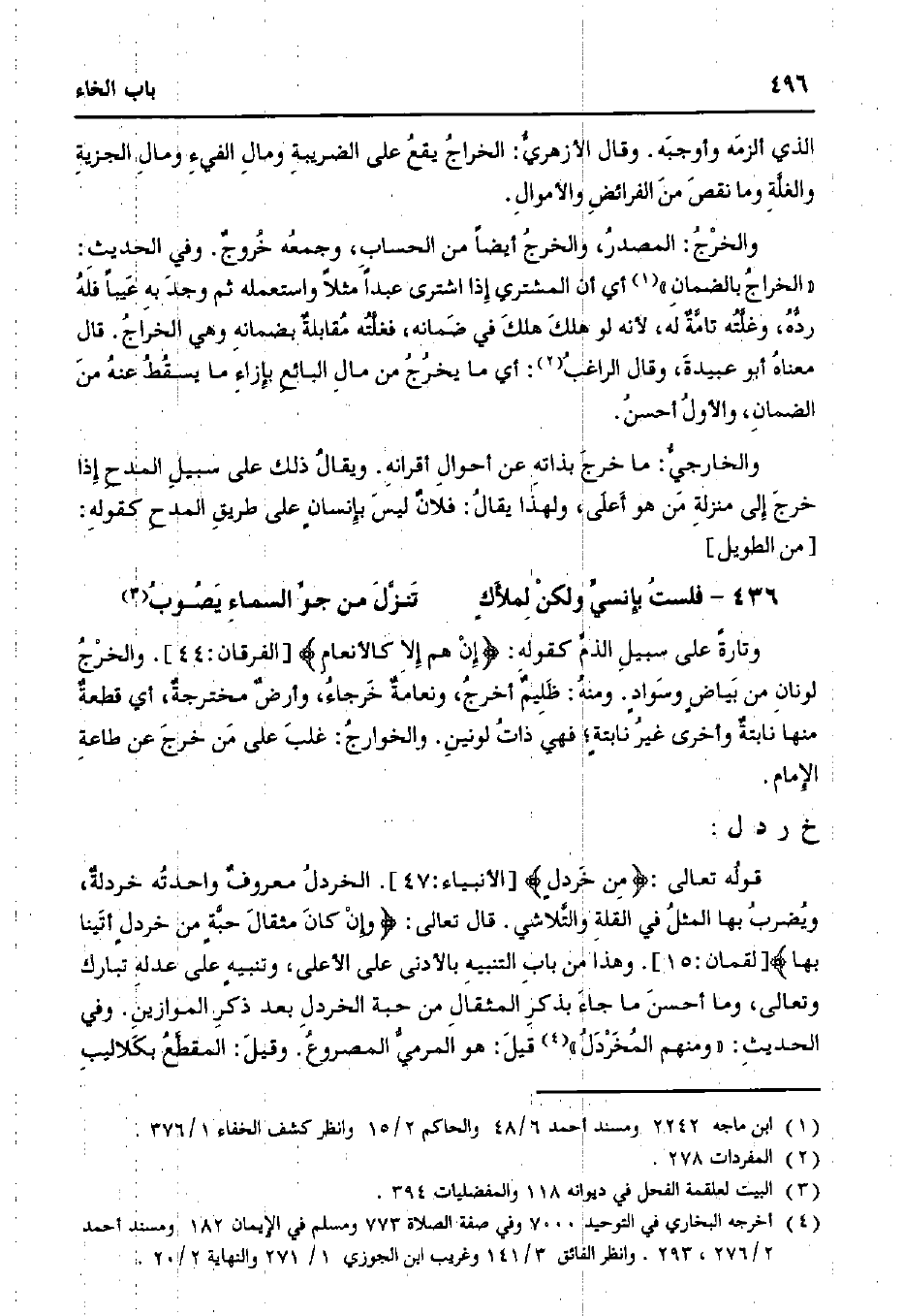 وتارة على سبيل الذم كقوله: {إن هم إلا كالأنعام} [الفرقان: 44]. والخرج لونان من بياض وسوادٍ ومنه: ظليم أخرج، ونعامة خرجاء، وأرض مخترجة، أي قطعة منها نابتة وأخرى غير نابتةٍ؛ فهي ذات لونين. والخوارج: غلب على من خرج عن طاعة الإمام.