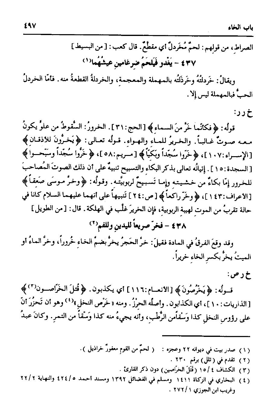 قوله: {فكأنما خر من السماء} [الحج: 31]. الخرور: السقوط من علو مكان يكون معه صوت غالبًا. والخرير للماء والهواء. قوله تعالى: {يخرون للأذقان} [الإسراء: 107]، {خروا سجدًا وبكيًا} [مريم: 58]، {خروا سجدًا وسبحوا} [السجدة: 15]. إتيانه تعالى بذكر البكاء والتسبيح تنبيه على أن ذلك الصوت المصاحب للخرور إما بكاء من خشيته وإما تسبيح لربوبيته. وقوله: {وخر موسى صعقًا} [الأعراف: 143]، {وخر راكعًا} [ص: 24] تنبيهًا على أنهما عليهما السلام كانا في حالة تقرب من الموت لهيبة الربوبية، فإن الخرير غلب في الهلكة. قال: [من الطويل]