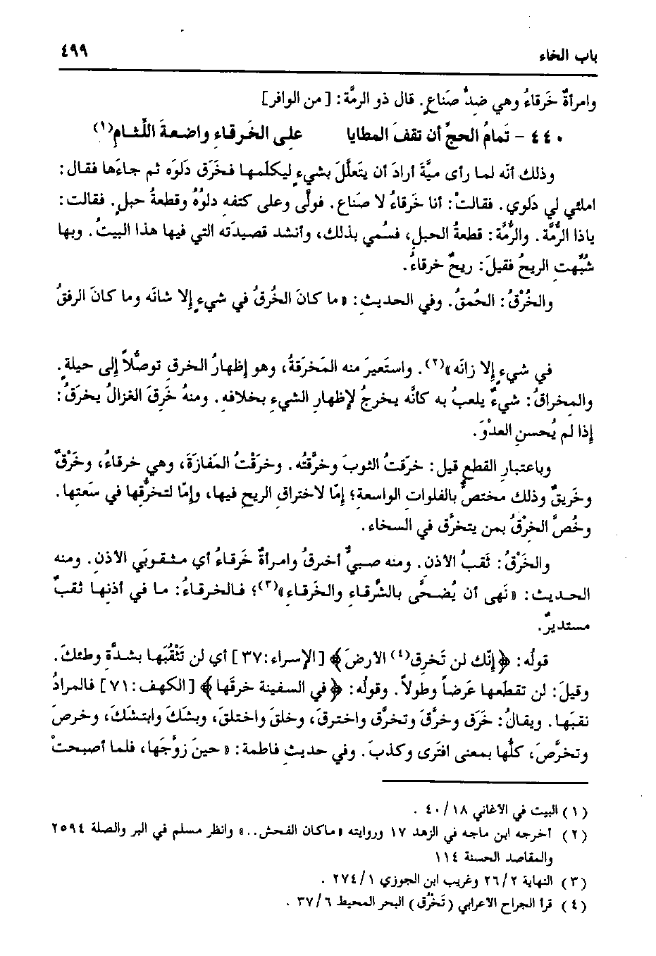 قوله: {إنك لن تخرق الأرض} [الإسراء: 37] أي لن تثقبها بشدة وطئك. وقيل: لن تقطعها عرضًا وطولاً. وقوله: {في السفينة خرقها} [الكهف: 71] فالمراد نقبها. ويقال: خرق وخرق وتخرق واخترق، وخلق واختلق، وبشك وابتشك، وخرص وتخرص، كلها بمعنى افترى وكذب. وفي حديث فاطمة: "حين زوجها، فلما أصبحت