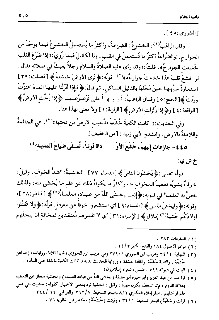 قال الراغب: الخشوع: الضراعة، وأكثر ما يستعمل الخشوع فيما يوجد من الجوارح.! والضراعة أكثر ما تستعمل في القلب. ولذلكقيل فيما روي: «إذا ضرع القلب خشعت الجوارح». قلت: «وقد رأى عليه الصلاة والسلام رجلًا بعبث في صلاته فقال: لو خشع قلب هذاخشعت جوارحه». قوله: {ترى الأرض خاشعة} [فصلت:39] استعارة شبهها حين محلها بالدليل الساكن. ثم قال: {فإذا أنزلنا عليها الماء اهتزت وريت} [الحج:5] وقال الراغب: تنبيهًا على تزعزعها {إذا رجت الأرض} [الواقعة:4] و {إذا زلزلت الأرض} [الزلزلة:1] ولا معنى لهذا هنا.