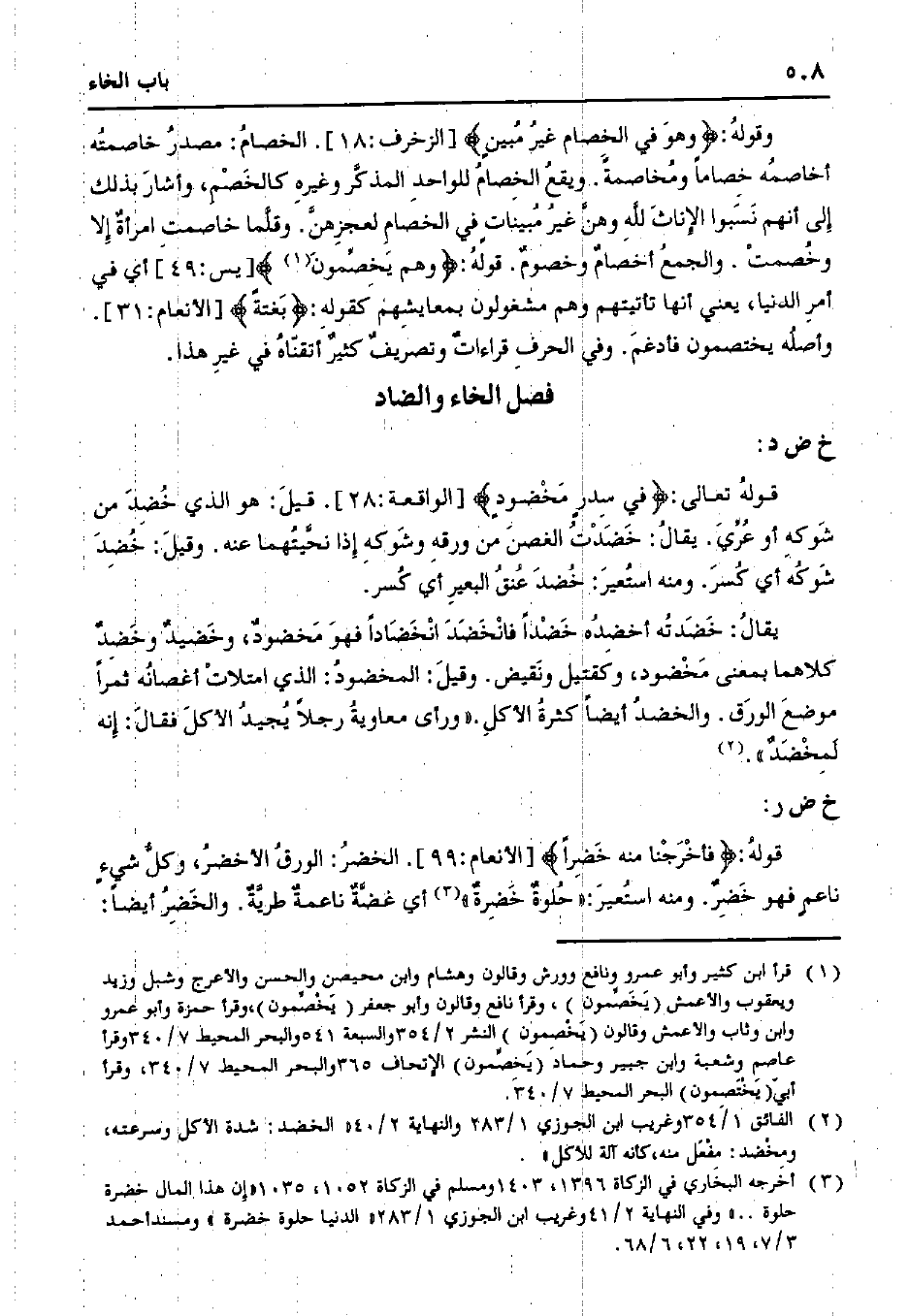 وقوله: {وهو في الخصام غير مبينٍ} [الزخرف:18]. الخصام: مصدر خاصمته أخاصمه خصامًا ومخاصمة. ويقع الخصام للواحد المذكر وغيره كالخصم، وأشار بذلك إلى أنهم نسبوا الإناث لله وهن غير مبيناتٍ في الخصام لعجزهن. وقلما خاصمت امرأة إلا وخصمت. والجمع أخصام وخصوم. قوله: {وهم يخصمون} [يس:49] أي في أمر الدنيا، يعني أنها تأتيهم وهم مشغولون بمعايشهم كقوله: {بغتةً} [الأنعام:31]. وأصله يختصمون فأدغم. وفي الحرف قراءات وتصريف كثير أتقناه في غير هذا.
