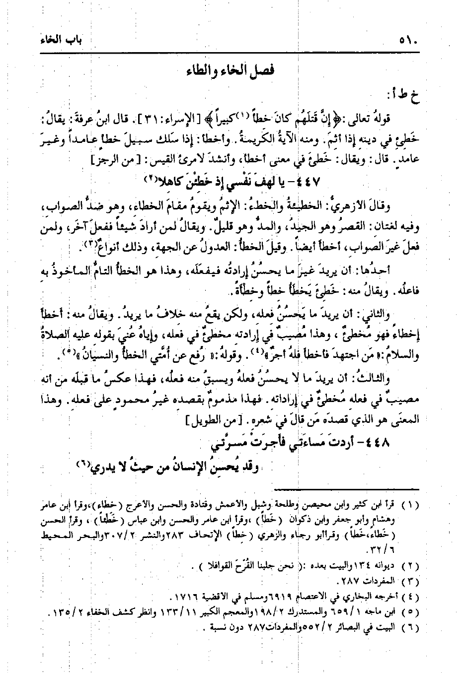 وقال الأزهري: الخطيئة والخطء: الإثم ويقوم مقام الخطأ، وهو ضد الصواب، وفيه لغتان: القصر وهو الجيد، والمد وهو قليل. ويقال لمن أراد شيئًا ففعل آخر، ولمن فعل غير الصواب، أخطأ أيضًا. وقيل الخطأ: العدول عن الجهة، وذلك أنواع.