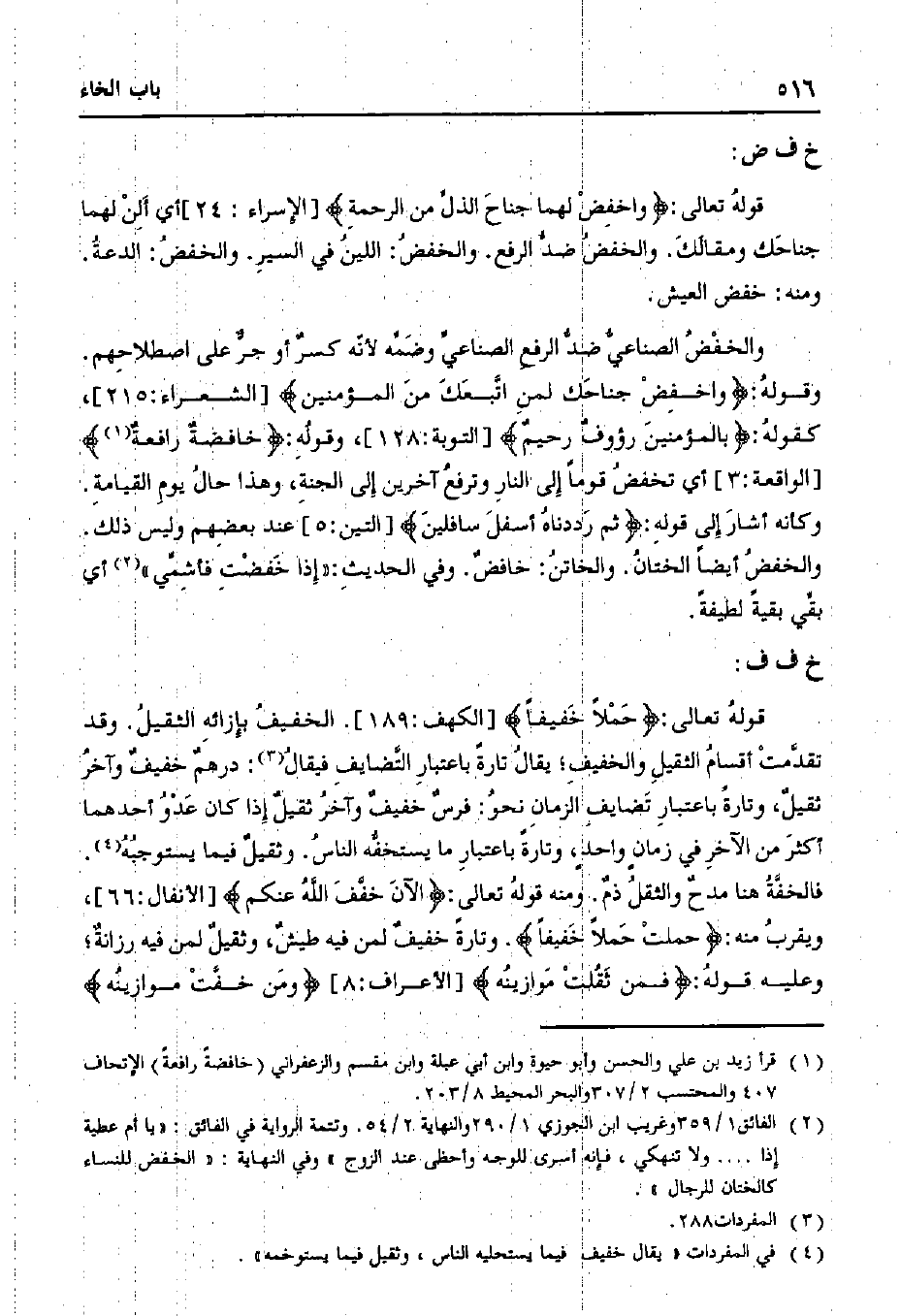 قوله تعالى: {حملًا خفيفًا} [الكهف: 189]. الخفيف بإزائه الثقيل. وقد تقدمت أقسام الثقيل والخفيف؛ يقال تارةً باعتبار التضايف فيقال: درهمٌ خفيفٌ وآخر ثقيلٌ، وتارةً باعتبار تضايف الزمان نحو: فرسٌ خفيفٌ وآخرٌ ثقيلٌ إذا كان عدو أحدهما أكثر من الآخر في زمانٍ واحدٍ، وتارةً باعتبار ما يستخفه الناس. وثقيلٌ فيما يستوجبه. فالخفة هنا مدحٌ والثقل ذمٌ. ومنه قوله تعالى: {الآن خفف الله عنكم} [الأنفال: 66]، ويقرب منه: {حملت حملًا خفيفًا}. وتارةً خفيفٌ لمن فيه طيشٌ، وثقيلٌ لمن فيه رزانةٌ، وعليه قوله: {فمن ثقلت موازينه} [الأعراف: 8] {ومن خفت موازينه}