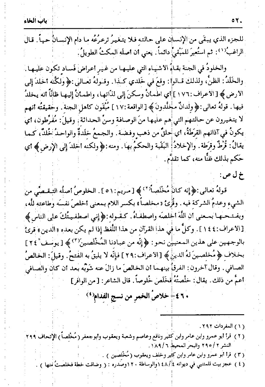 قوله تعالى: {إنه كان مخلصًا} [مريم: 51]. الخلوص أصله التقصي من الشيء وعدم الشركة فيه. وقرئ «مخلصًا» بكسر اللام بمعنى أخلص نفسه وطاعته لله، وبفتحها بمعنى أن الله أخلصه واصطفاه. كقوله: {إني اصطفيتك على الناس} [الأعراف: 144]. وكل ما في هذا القرآن من هذا اللفظ إذا لم يكن بعده «الدين» قرئ بالوجهين على هذين المعنيين نحو: {إنه من عبادنا المخلصين} [يوسف 24] بخلاف {مخلصين له الدين} [الأعراف: 29] فإنه لا يليق به الفتح. وقيل: الخالص الصافي. وقال آخرون: الفرق بينهما أن الخالص ما زال عنه شوبه بعد أن كان والصافي أعم من ذلك. يقال: خلصته فخلص خلوصًا. قال الشاعر: [من الوافر]
