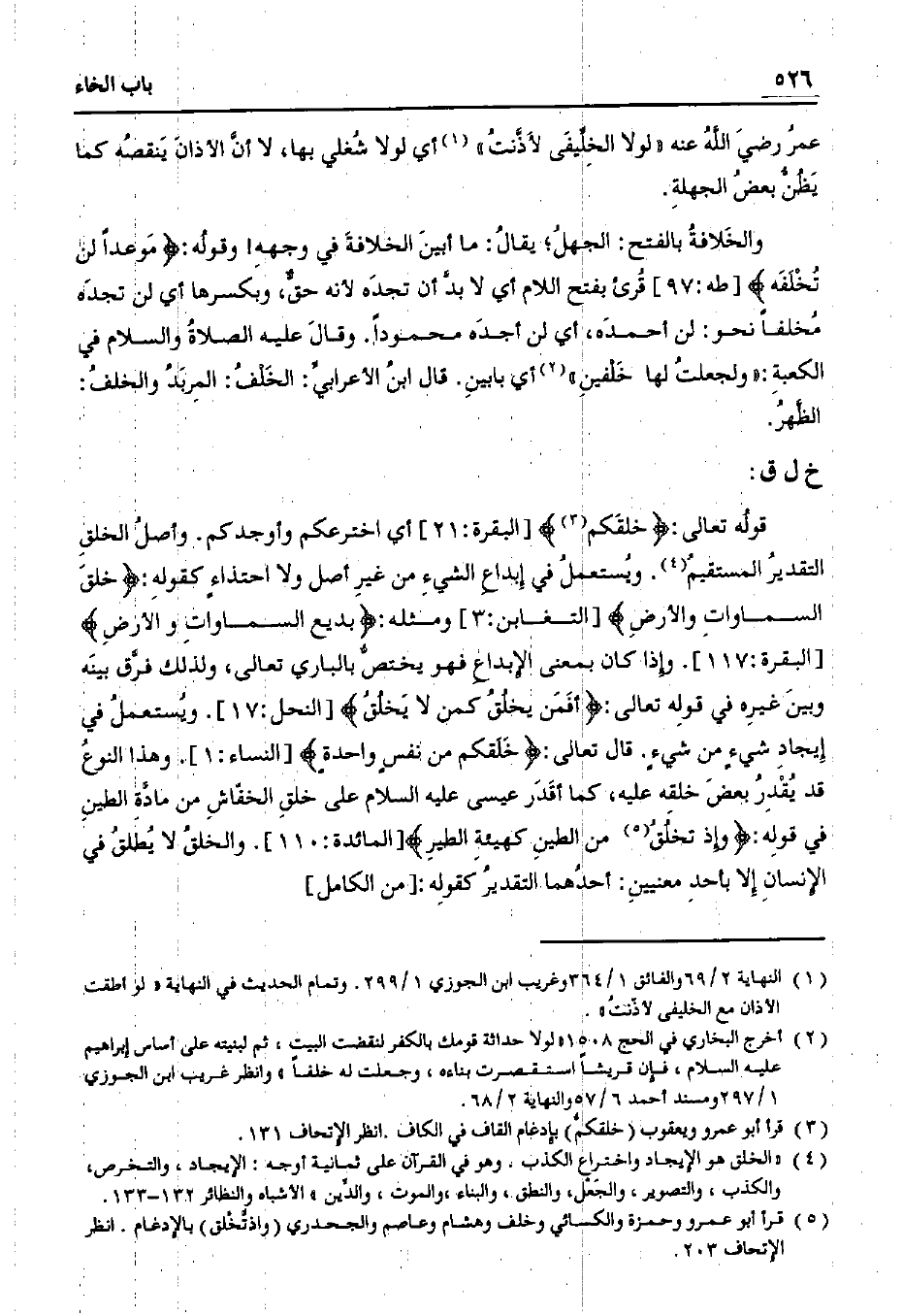 والخلافة بالفتح: الجهل؛ يقال: ما أبين الخلافة في وجهه! وقوله: {موعدًا لن تخلفه} [طه: 97] قرئ بفتح اللام أي لابد أن تجده لأنه حق، وبكسرها أي لا تجده مخلفًا نحو: لن أحمده، أي لن أجده محمودًا. وقال عليه الصلاة والسلام في الكعبة: «ولجعلت لها خلفين» أي بابين. قال ابن الأعرابي: الخلف: المربد والخلف: الظهر.