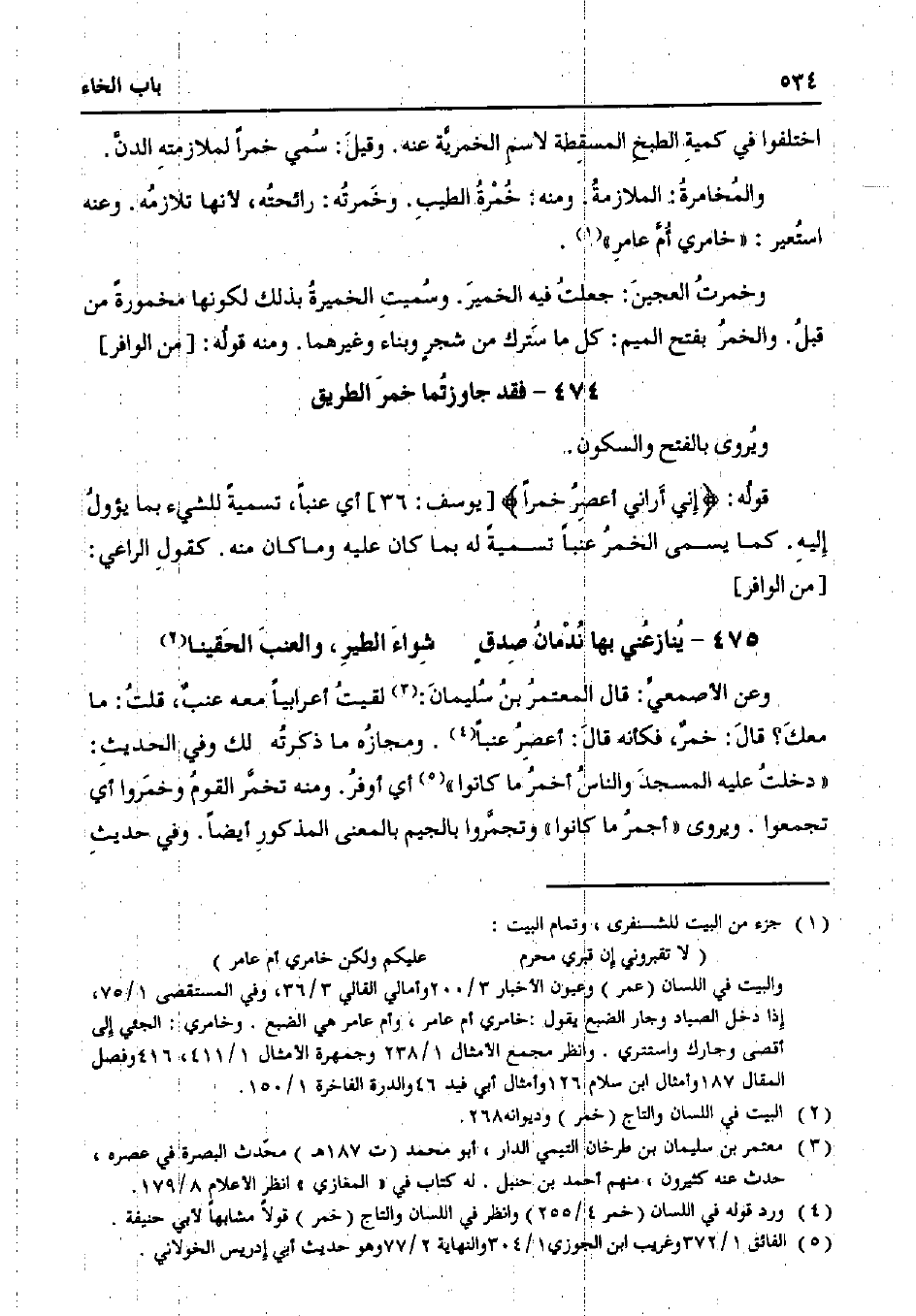 وعن الأصمعي: قال المعتمر بن سليمان: لقيت أعرابيًا معه عنبٌ، قلت: ما معك؟ قال: خمرٌ، فكأنه قال: أعصر عنبًا. ومجازه ما ذكرته لك وفي الحديث: "دخلت عليه المسجد والناس أخمر ما كانوا" أي أوفر. ومنه تخمر القوم وخمروا أي تجمعوا. ويروى "أجمر ما كانوا" وتجمروا بالجيم بالمعنى المذكور أيضًا. وفي حديث