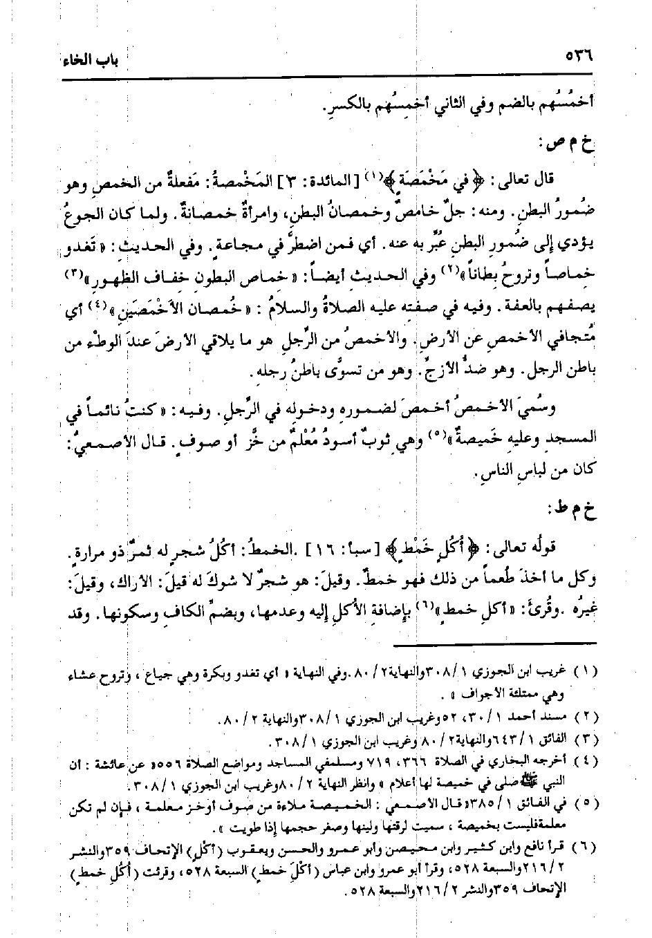 وسمي الأخمص أخمص لضموره ودخوله في الرجل. وفيه: "كنت نائمًا في المسجد وعليه خميصةٌ" وهي ثوبٌ أسود معلمٌ من خز أو صوفٍ. قال الأصمعي: كان من لباس الناس.