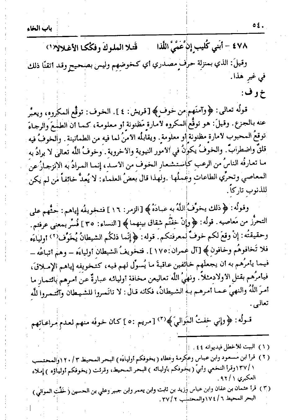 وحقيقته: إن وقع لكم خوفٌ لمعرفتكم. قوله: {إنما ذلكن الشيطان يخوف أولياءه فلا تخافوهم وخافون} [آل عمران: 175]. فتخويف الشيطان أولياءه -وهم أتباعه -فيما يأمرهم به أن يجعلهم خائفين عاقبة ما يسول لهم فيه، كتخويفه إياهم الإملاق، فيأمرهم بقتل الأولاد مثلاً. ونهي الله تعالى عن مخافة أوليائه عبارةٌ عن أمرهم بائتمار ما أمر الله والنهي عما أمرهم به الشيطان، فكأنه قال: لا تاتمروا للشيطان وآئتمروا لله تعالى.