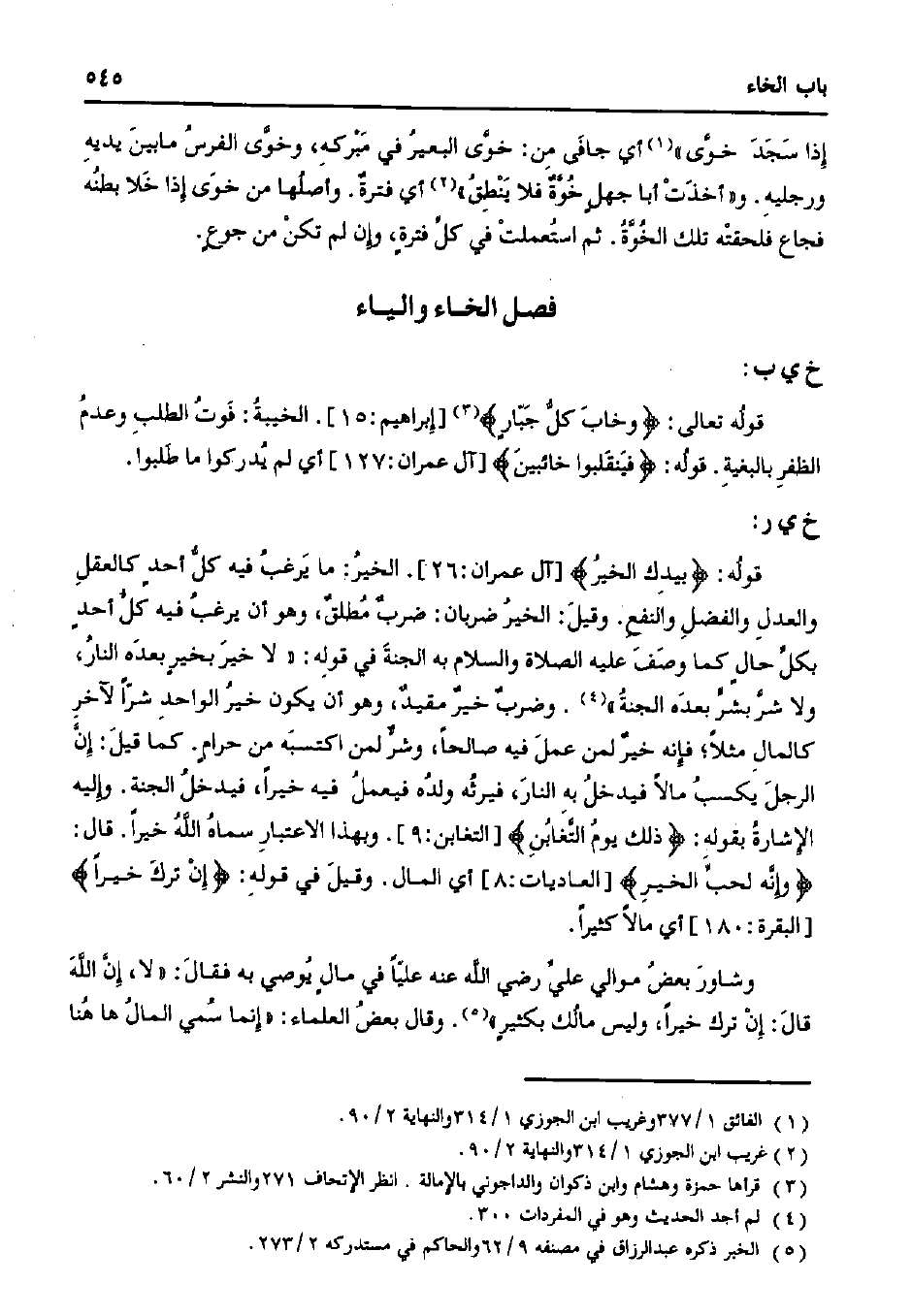 قوله: {بيدك الخير} [آل عمران: 26]. الخير: ما يرغب فيه كل أحدٍ كالعقل والعدل والفضل والنفع. وقيل: الخير ضربان: ضرب مطلق، وهو أن يرغب فيه كل أحدٍ بكل حالٍ كما وصف عليه الصلاة والسلام به الجنة في قوله: "لا خير بخيرٍ بعده النار، ولا شر بشر بعده الجنة". وضرب خير مقيد، وهو أن يكون خير الواحد شرًا لآخر كالمال مثلاً؛ فإنه خير لمن عمل فيه صالحًا، وشر لمن اكتسبه من حرامٍ. كما قيل: إن الرجل يكسب مالاً فيدخل به النار، فيرثه ولده فيعمل فيه خيرًا، فيدخل الجنة. وإليه الإشارة بقوله: {ذلك يوم التغابن} [التغابن: 9]. وبهذا الاعتبار سماه الله خيرًا. قال: {وإنه لحب الخير} [العاديات: 8] أي المال. وقيل في قوله: {إن ترك خيرًا} [البقرة: 180] أي مالاً كثيرًا.